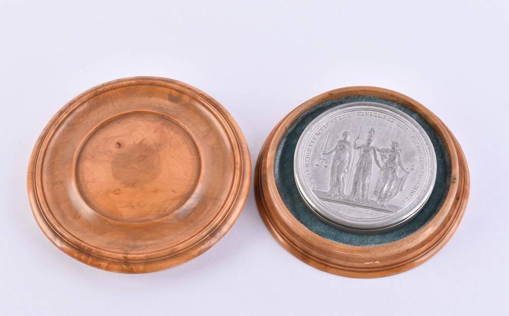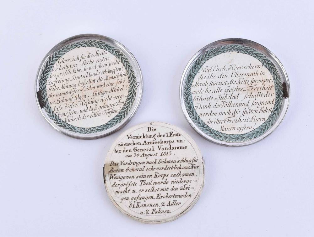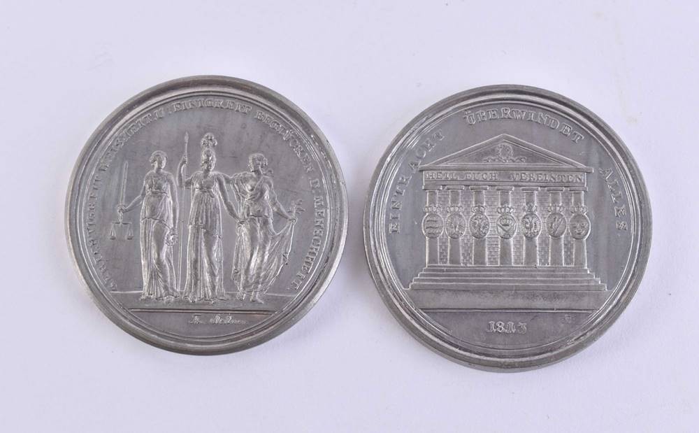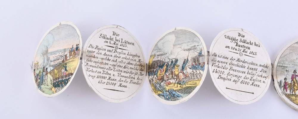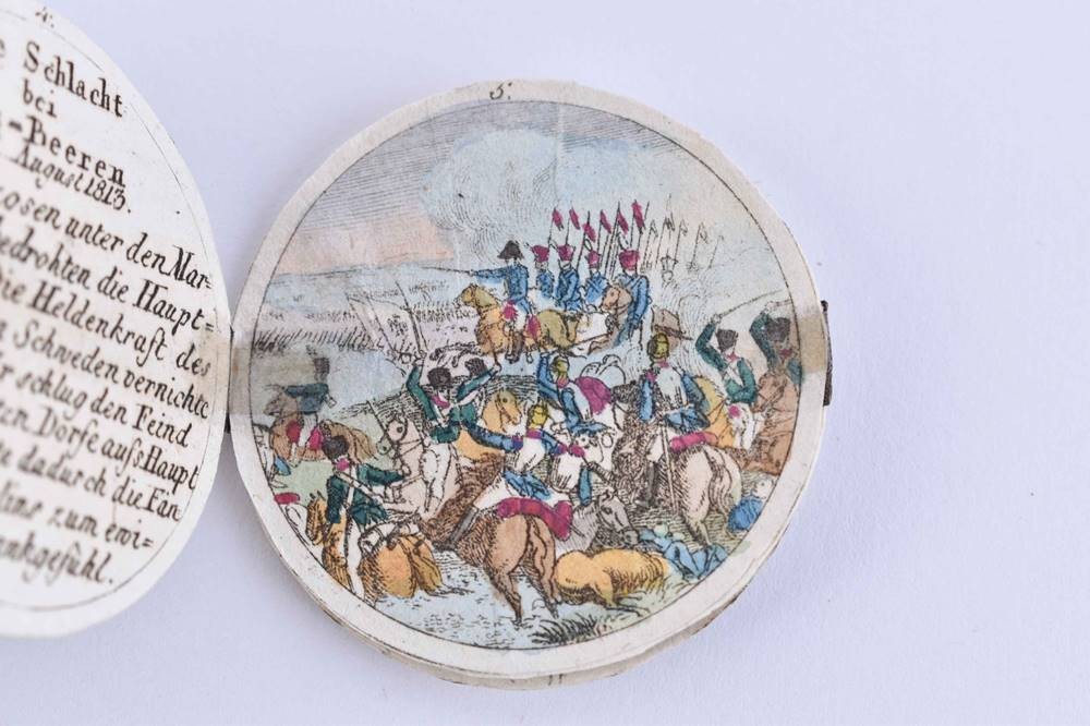 Zinnsteckmedaille von Stettner unter Friedrich Wilhelm III. (1797-1840), auf die Befreiungskriege, Slg. Merseburger 3723, Gewicht 32,7 g., Ø 51 mm, Inhalt: 12 miteinander verbundene, doppelseitige farbige Kupferstiche mit Darstellungen von Schlachtszenen und Beschreibungen, Zustand vorzüglich