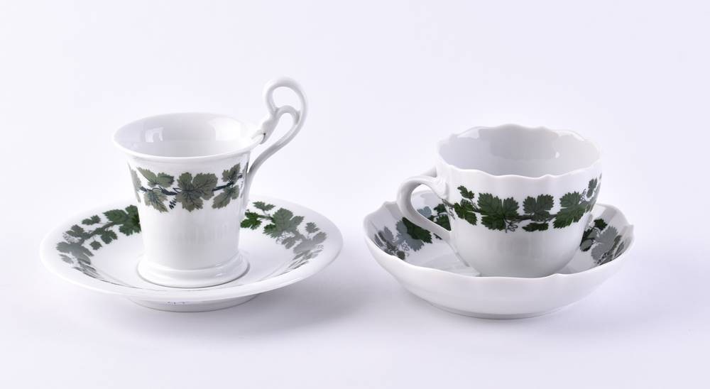 Porzellan, Dekor Weinlaub, blaue Schwertermarke, 1. Wahl, Tassenhöhe 5,3 cm & 5,5 cm