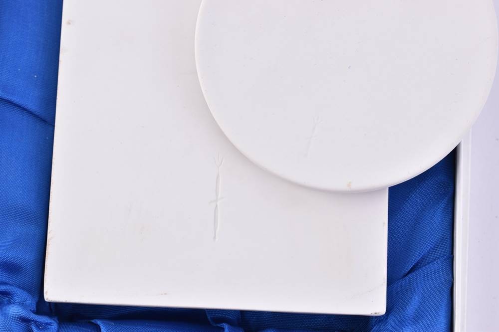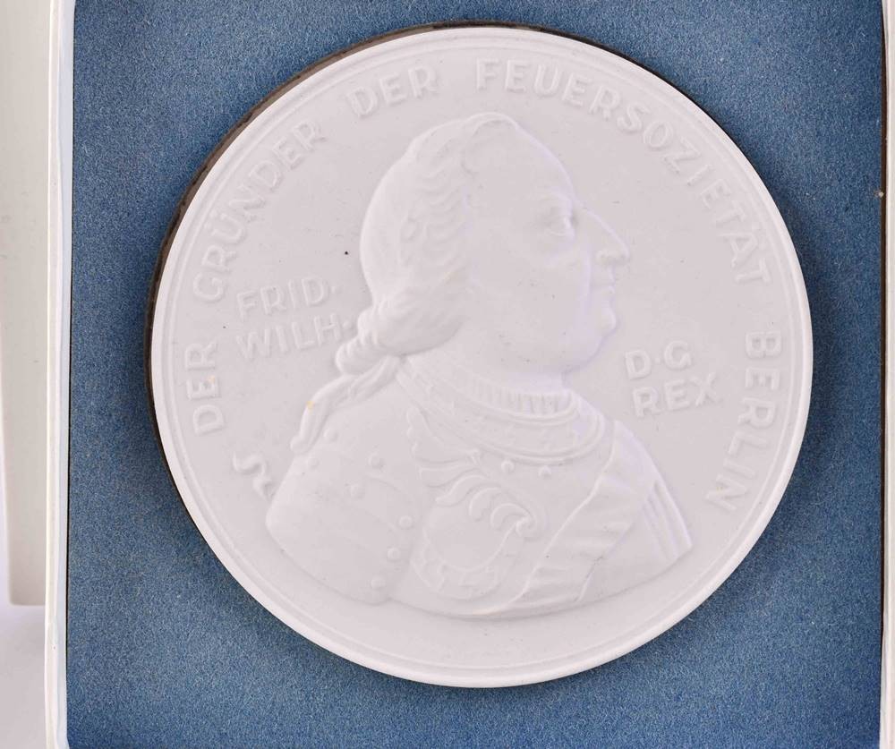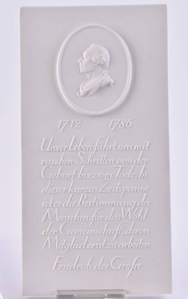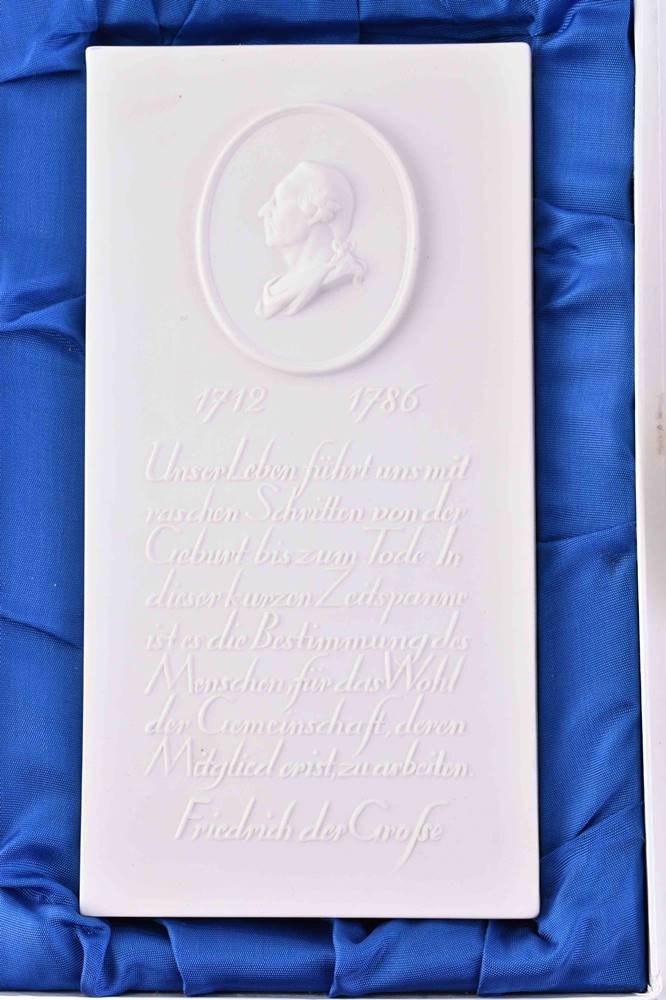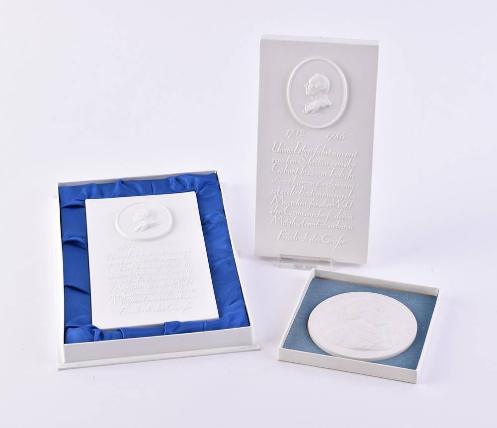 Porzellan, Darstellung Friedrich der Große, 2x rechteckig (17,3 cm x 9 cm x 1,2 cm), 1x rund (Ø 8 cm ), gepresste Zeptermarke, 1. Wahl