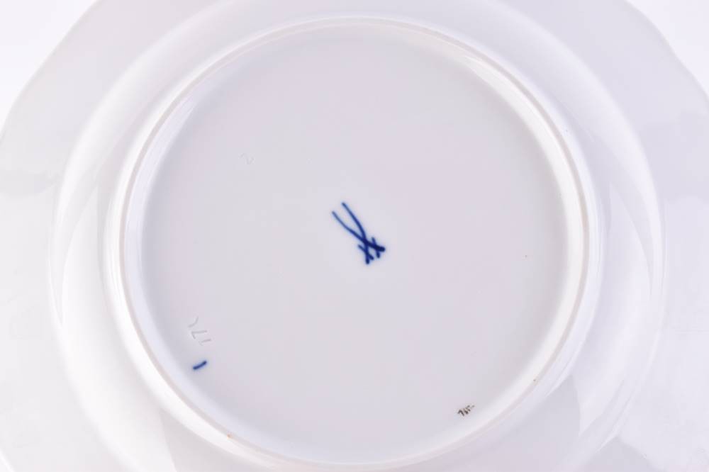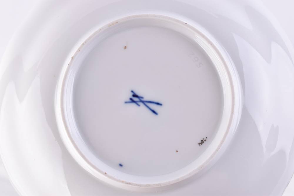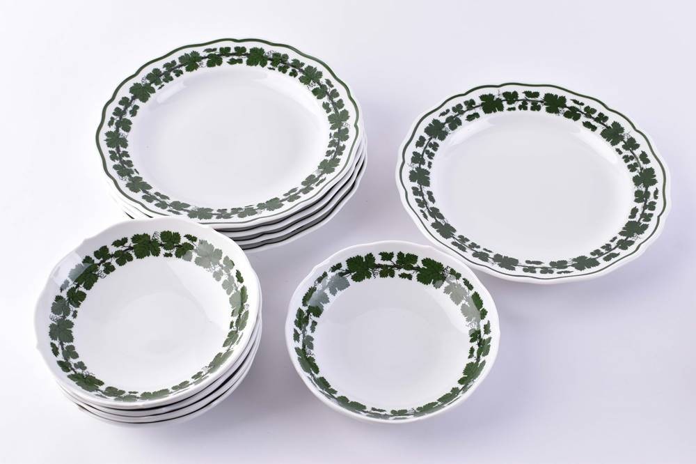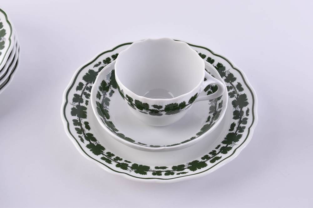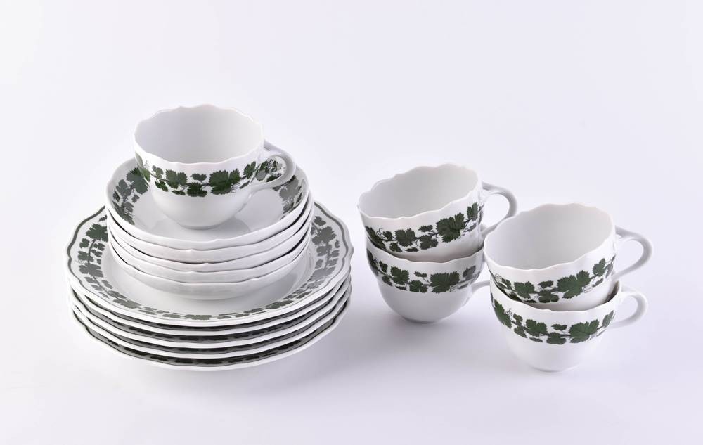 Porzellan, Dekor Weinlaub, blaue Schwertermarke, 1. Wahl, 5 Kuchenteller Ø 20 cm, 5 Untertassen 14 cm, 5 Tassen Höhe 6,5 cm
