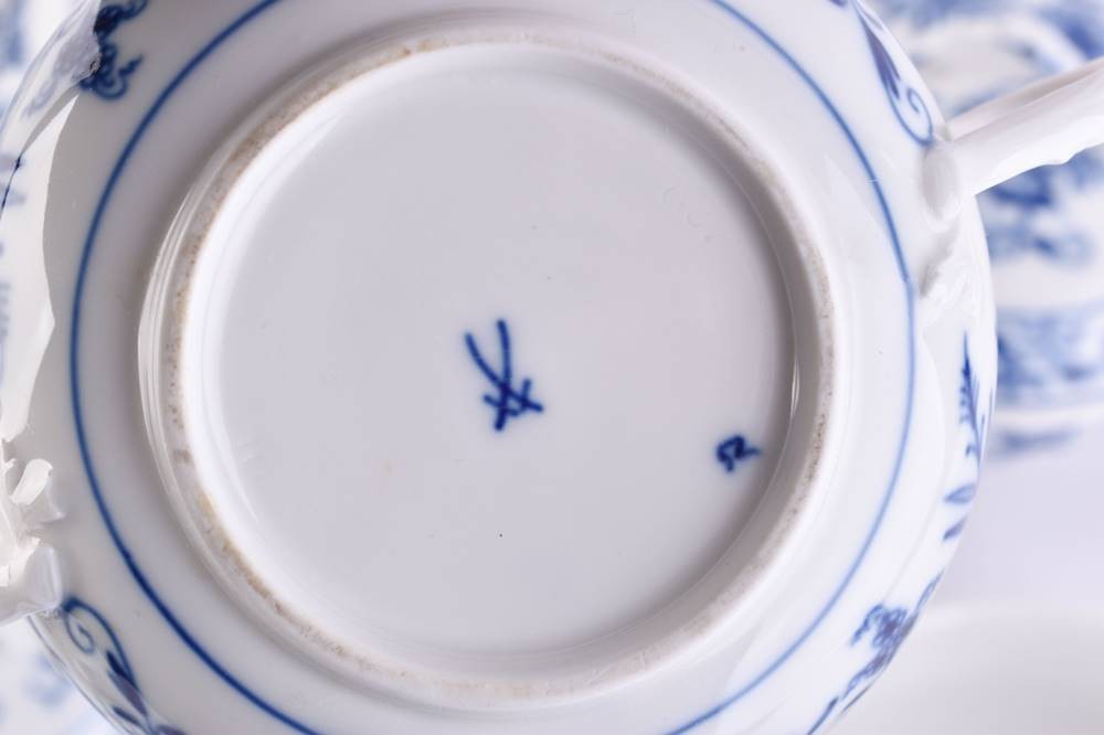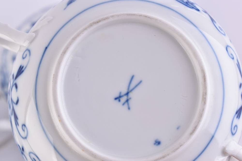 Porzellan, Dekor Zwiebelmuster, Schwertermarke, 3 Schleifstriche, mit seitlichen Handhaben, H: 10 cm Ø 12 cm, als Beigabe 1 Untertasse (Ø 19,5 cm)