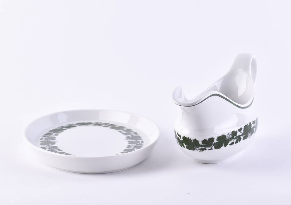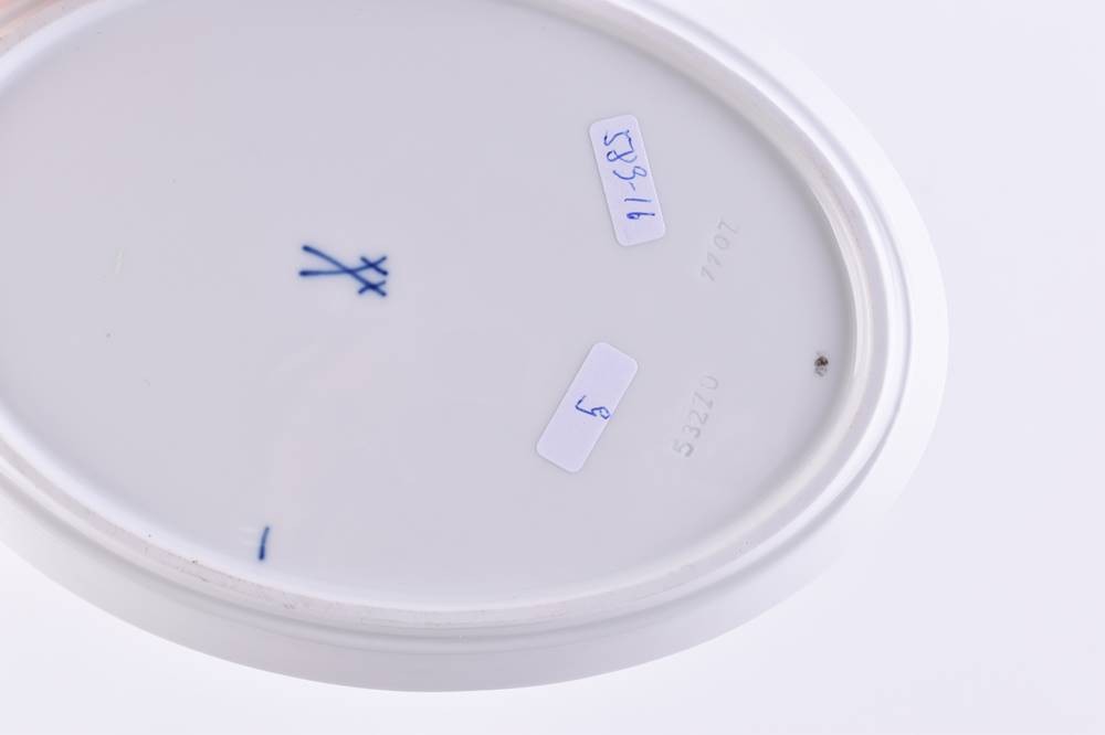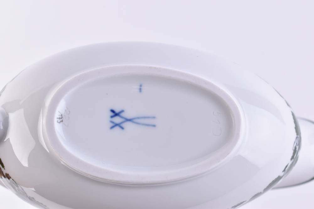 Porzellan, Dekor Weinlaub, Schiffchen H. 8 cm x 19 cm x 9,5 cm, Unterteller H. 2 cm x 18 cm x 13 cm, blaue Schwertermarke, 2 Schleifstriche