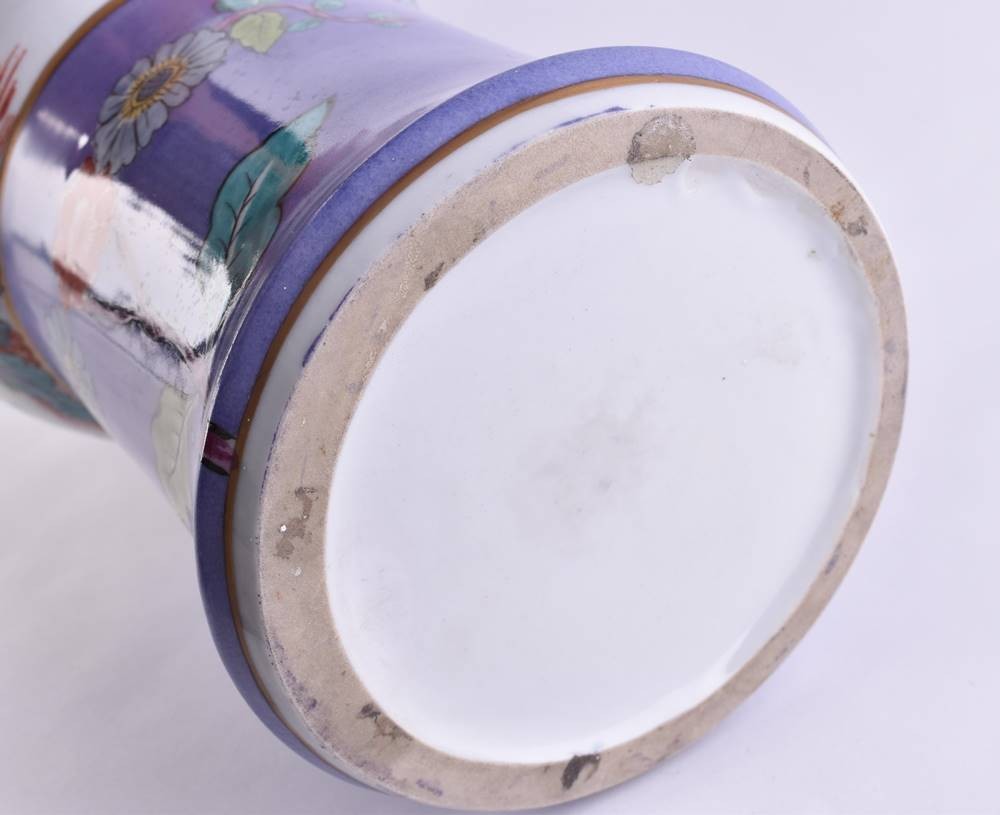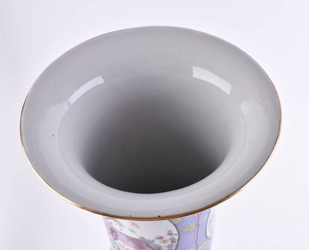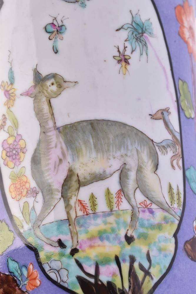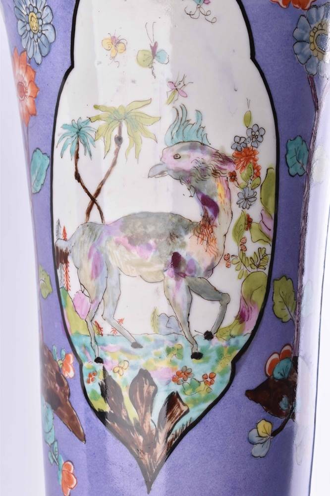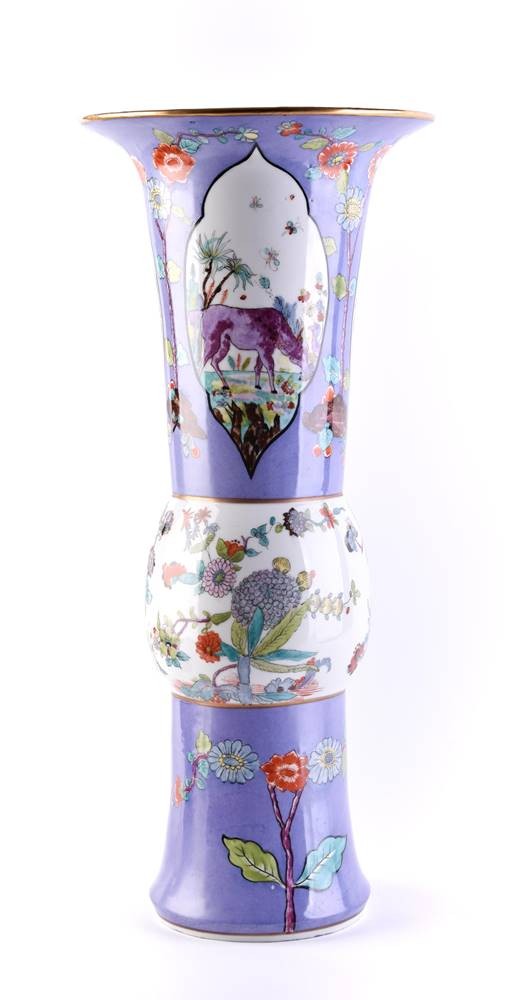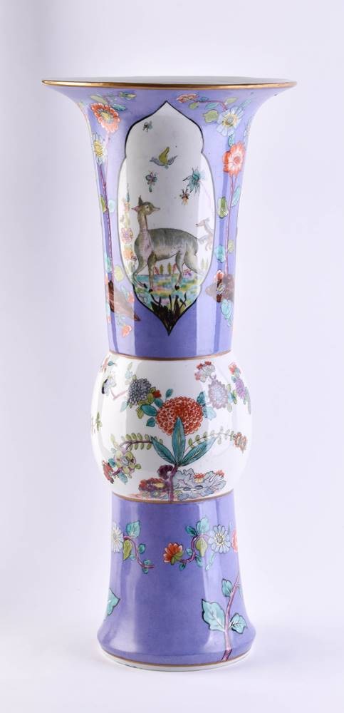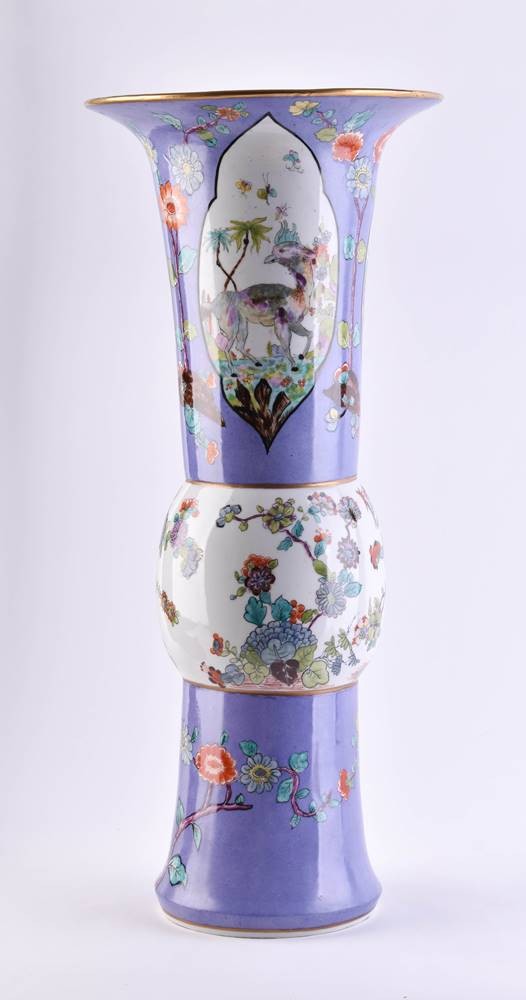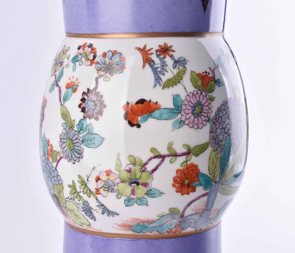 Balusterförmige Wandung, ausgesparte Reserven, Fantasielandschaften und Fabeltiere, pflaumenblauer Fond mit Blumendekor im ostasiatischen Stil und Goldrändern