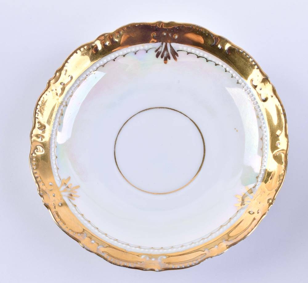 Porzellan, farbig und gold staffiert, floraler Dekor, Schlesien, Tassenhöhe: 7,5 cm, Untertasse: Ø 15 cm