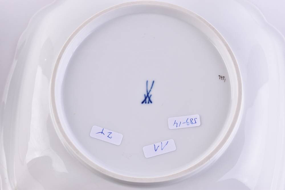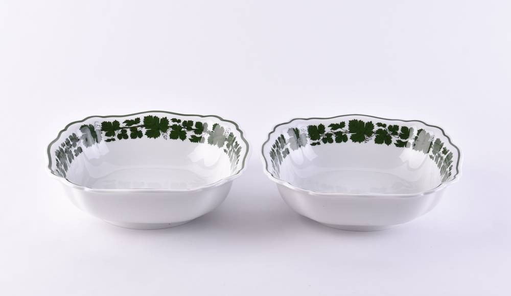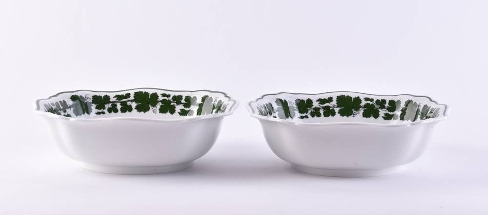 Porzellan, 2 Teile, Dekor Weinlaub, 1. Schüssel 7 cm x 22,5 cm x 22 cm, 2. Schüssel 6,5 cm x 22 cm x 22 cm, blaue Schwertermarke, 2 Schleifstriche