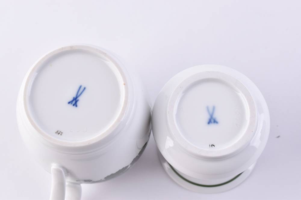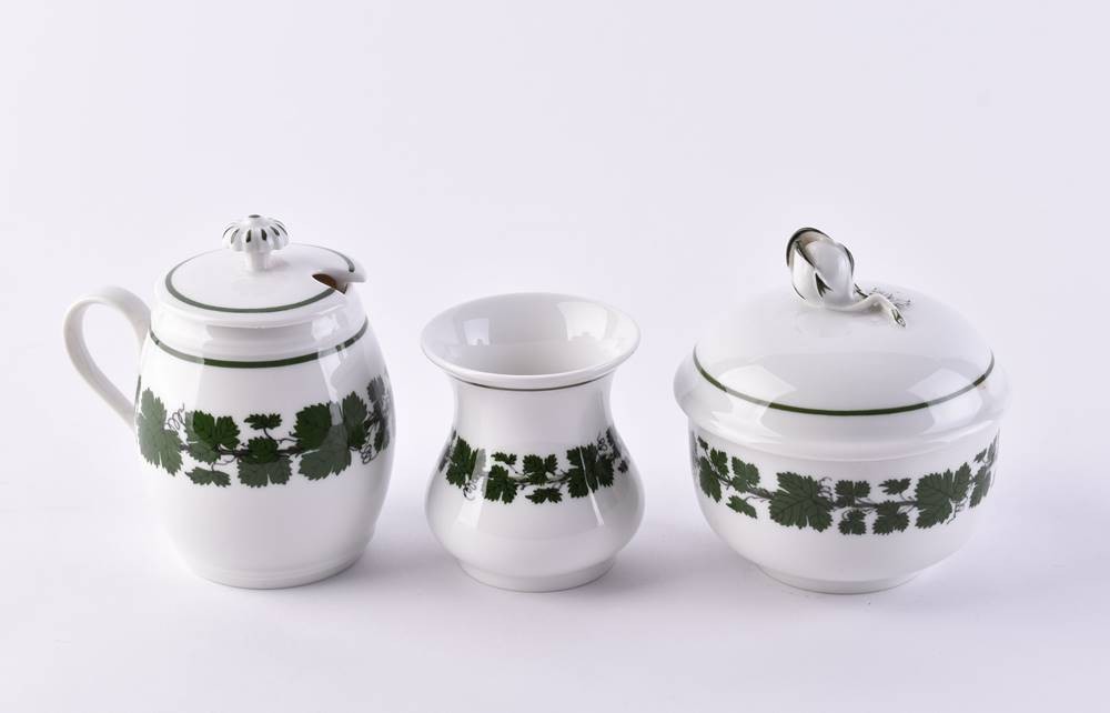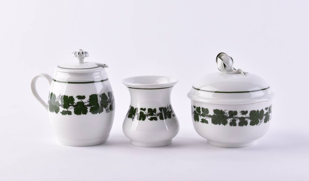 Porzellan, 3 Teile, Dekor Weinlaub, 1 Deckeldose Höhe 10 cm, 1 Senfgefäß Höhe 10 cm, 1 Vase Höhe 6,5 cm, blaue Schwertermarke, 1. Wahl