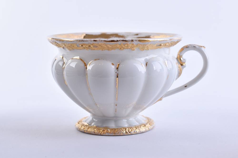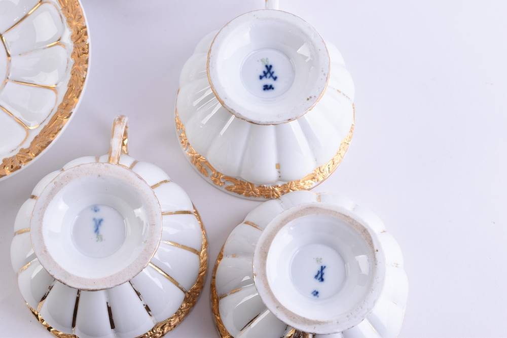 Porzellan, 10 teilig, gold staffiert, berieben, 4 Tassen (H. 6,7 cm), 6 Untertassen (Ø 15 cm), blaue Schwertermarke, 1. Wahl