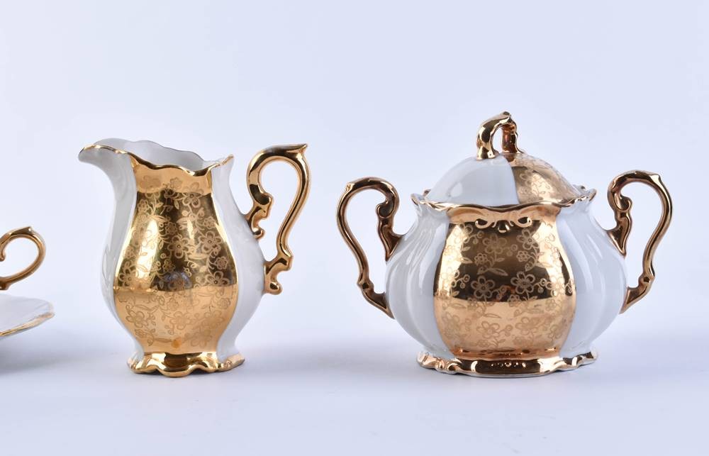 Porzellan, 6 Teile, alle gold staffiert, alle mit Bodenmarke, 1 Zuckerdose: H. 9,5 cm, 1 Sahnegießer: H. 8 cm, 2 Tassen: H. 4 cm, 2 Untertassen: Ø 11 cm
