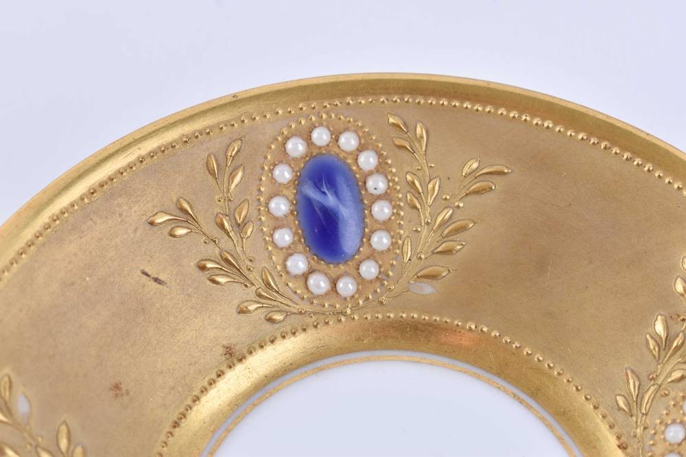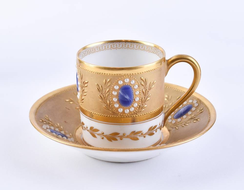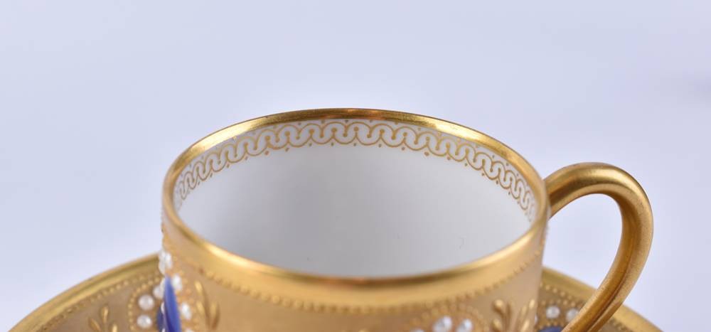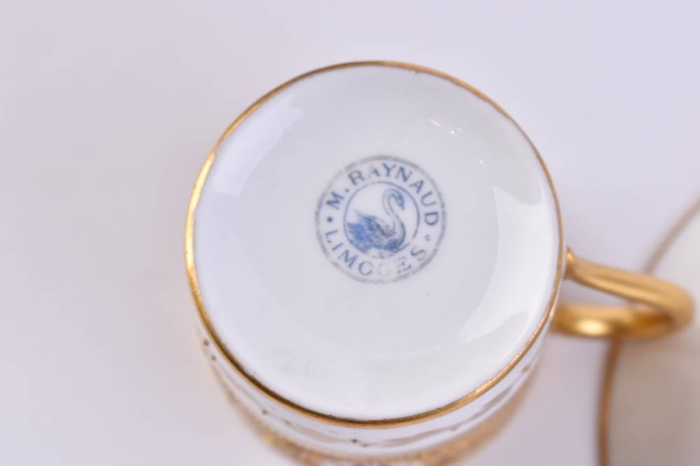 Porzellan, Juwelendekor mit reicher Matt- und Glanzgoldstaffage, florale Ornamentik, Bodenmarke M. Raynaud Limoges, Tassenhöhe: 5 cm, Untertasse: Ø 10 cm