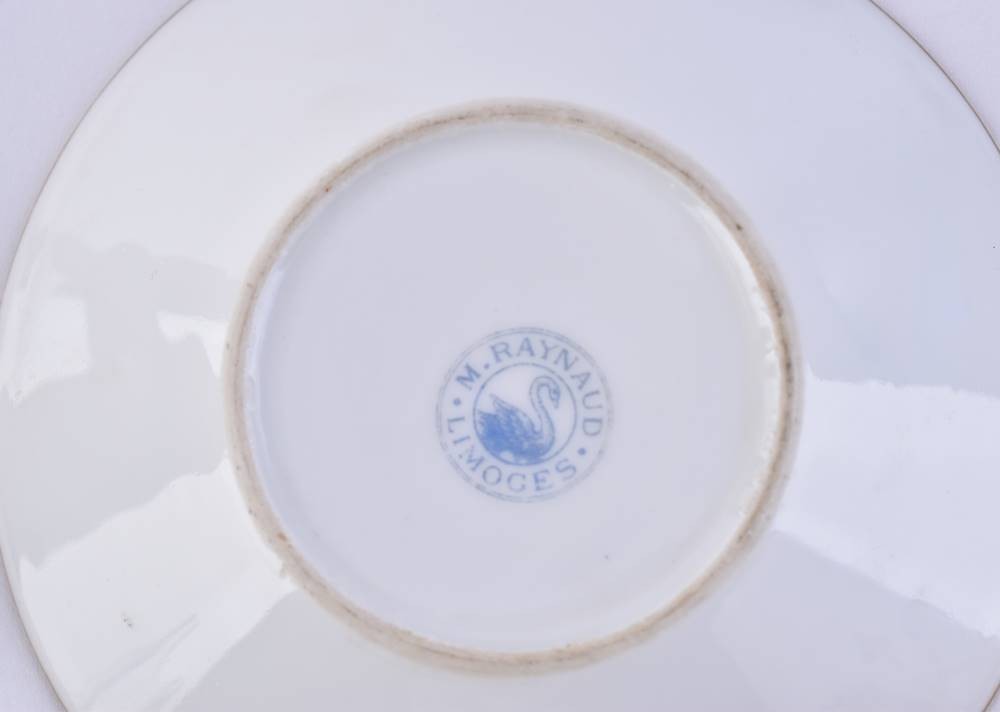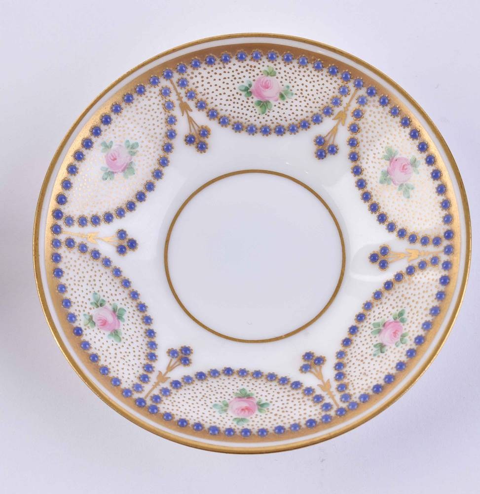 Porzellan, Juwelendekor mit Matt- und Glanzgoldstaffage, florale Ornamentik und Rosendekor, Bodenmarke M. Raynaud Limoges, Tassenhöhe: 5 cm, Untertasse: Ø 10 cm