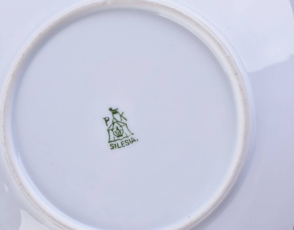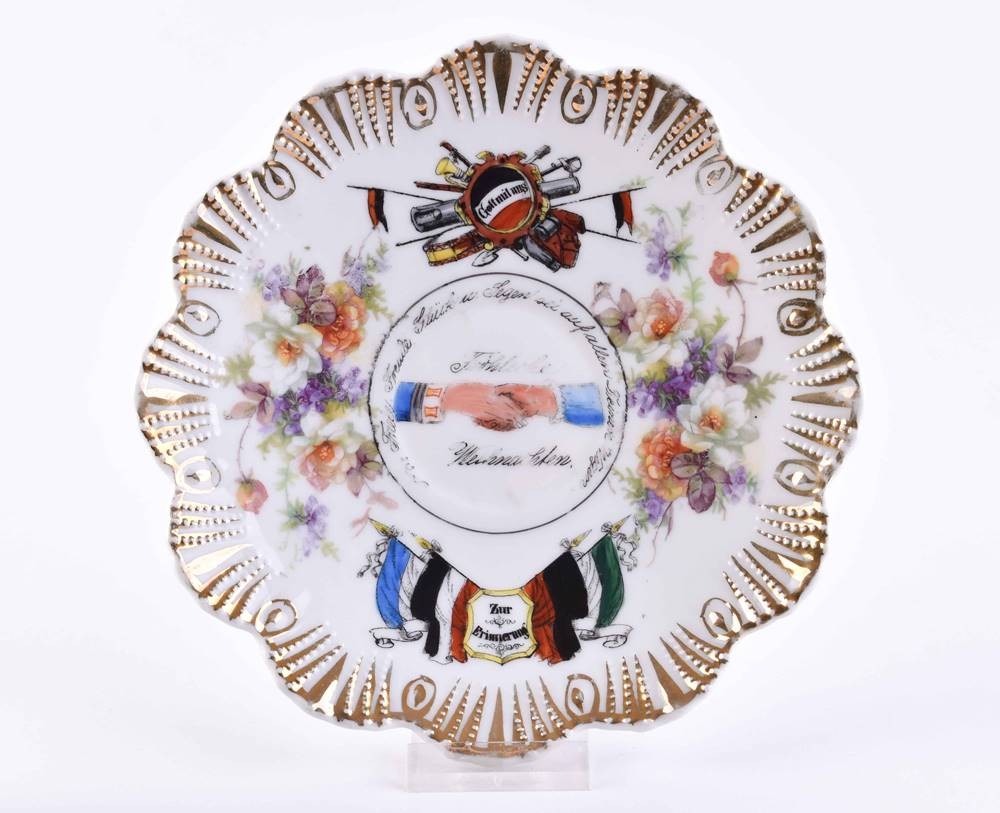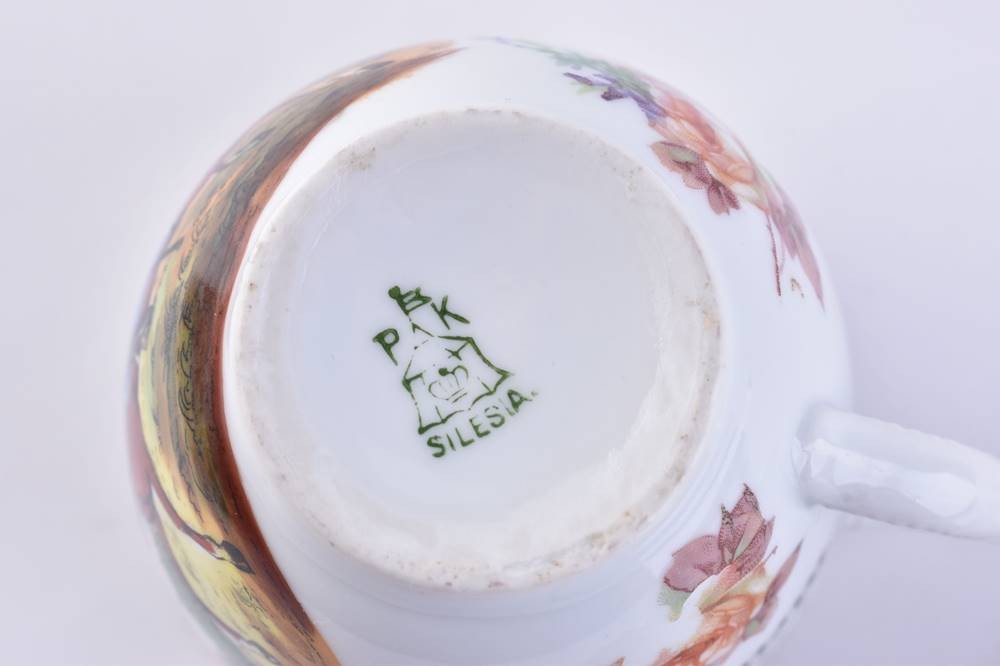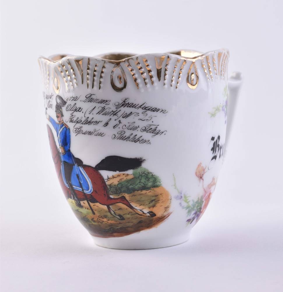 Porzellan, farbig und gold staffiert, mit militärischen Szenen und Sinnsprüchen, als Weihnachtsgeschenk Weihnachten 1913 an seine Braut von einem Reiteroffizier, unterm Stand Bodenmarke Schlesien, Tassenhöhe: 9 cm, Untertasse: Ø 16,5 cm