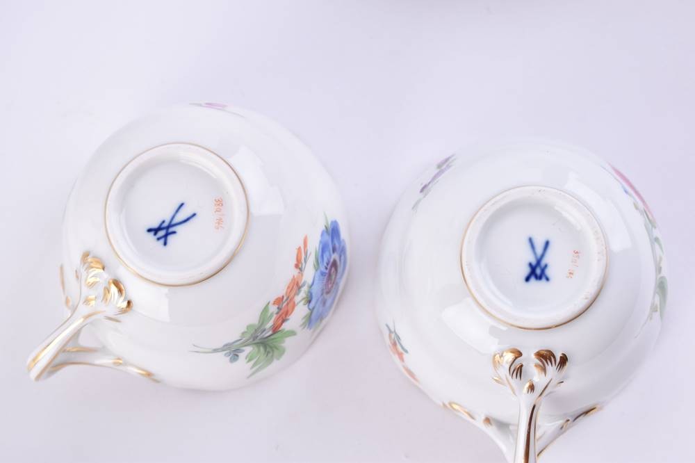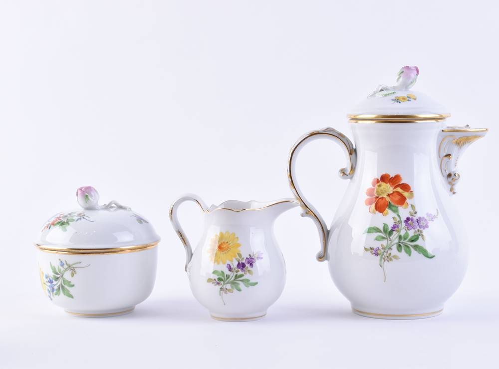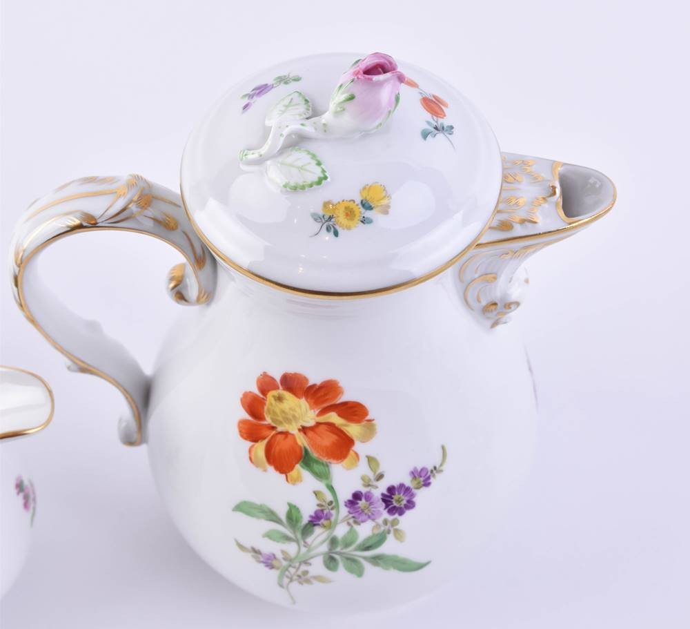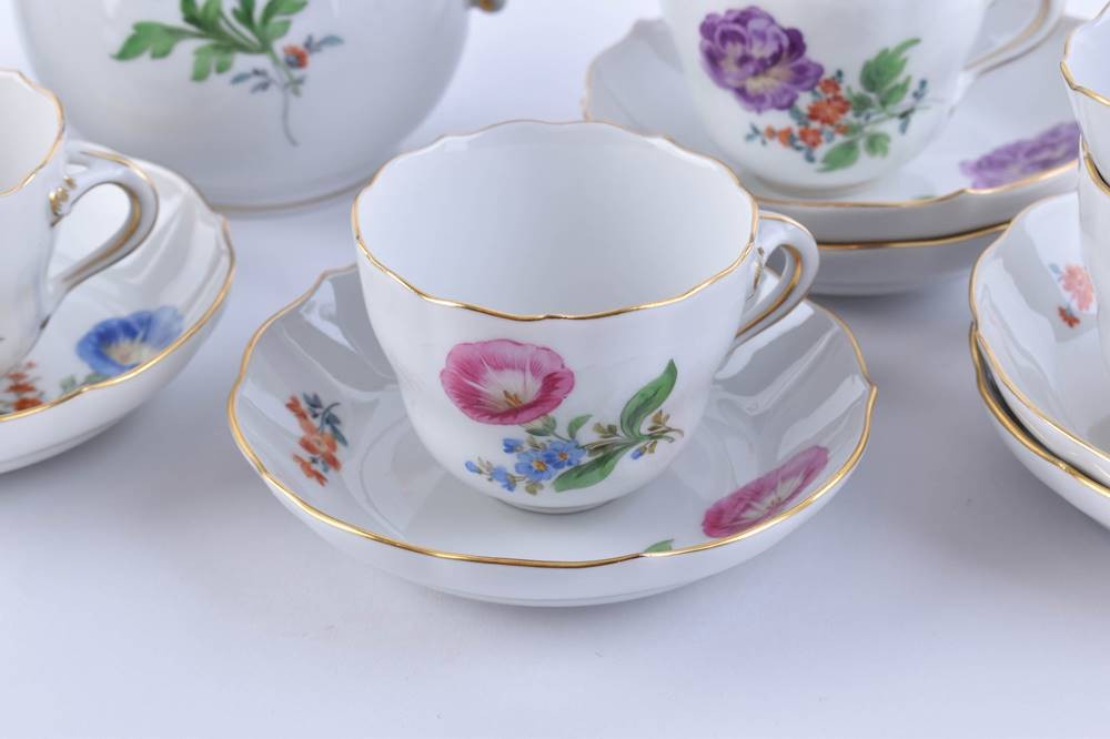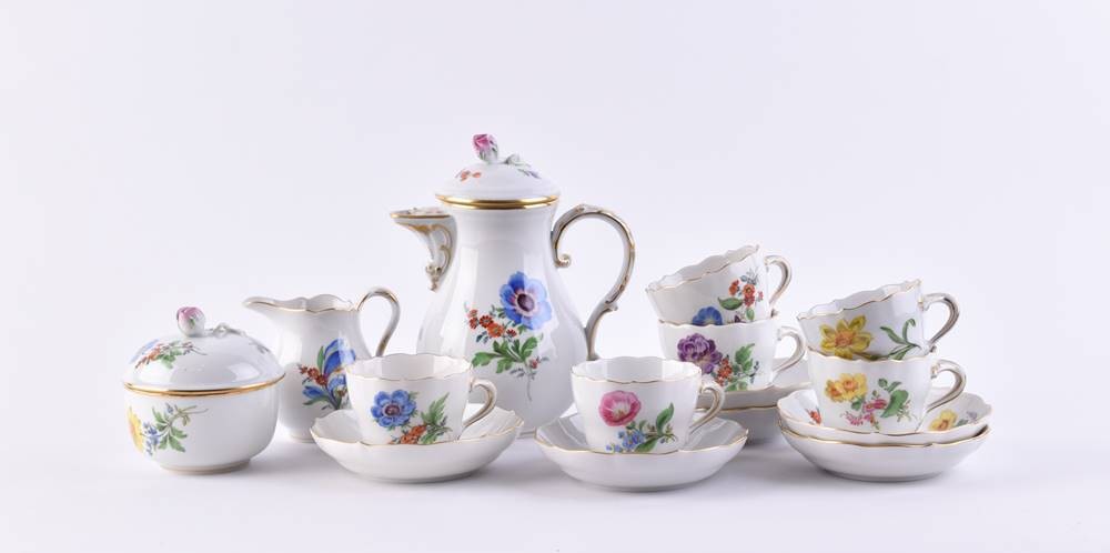 Porzellan, 15 Teile, farbig und gold staffiert, Dekor deutsche Blume Bouquet, 6 Tassen (H. 5 cm), 6 Untertassen (Ø 11 cm), 1 Sahnegießer (H. 8 cm), eine Zuckerdose (H. 8,5 cm, Ø 8 cm), 1 Mokkakanne (H. 16,5 cm), blaue Schwertermarke, 1. und 2. Wahl