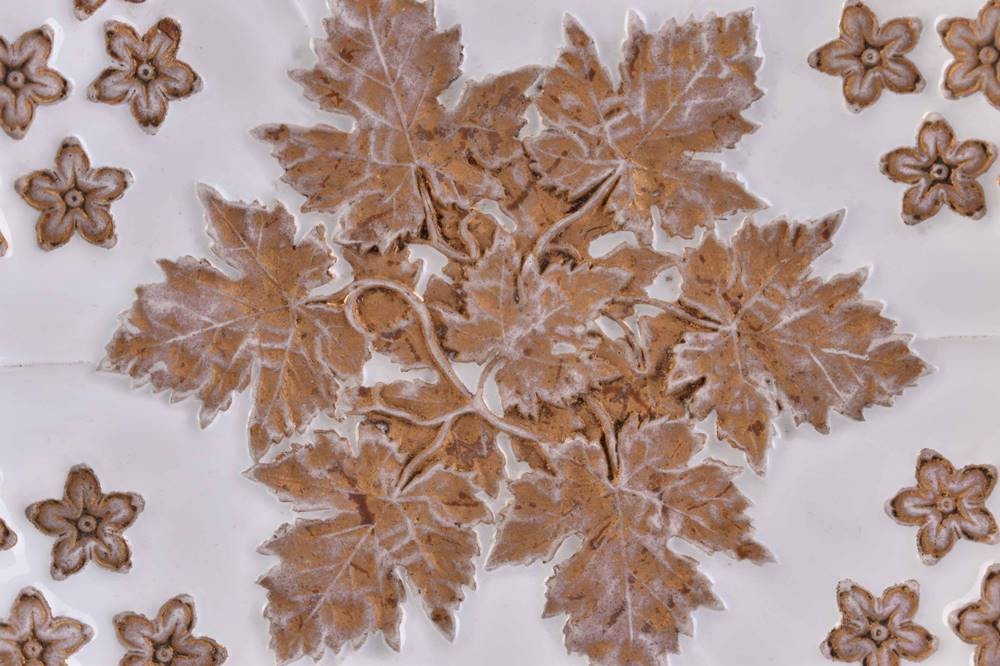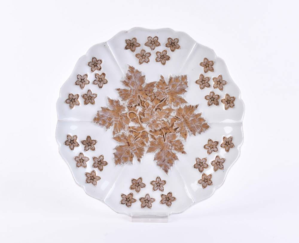 Porzellan, gold staffiert, mit plastischem Blatt- und Blütenwerk, Gold oxidiert, Modellnummer 464 und Bossierer Zeichen, blaue Schwertermarke, am Stand Minichip, Ø 21 cm
