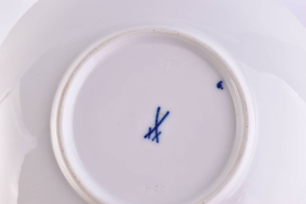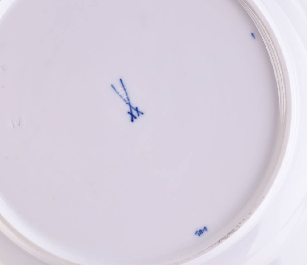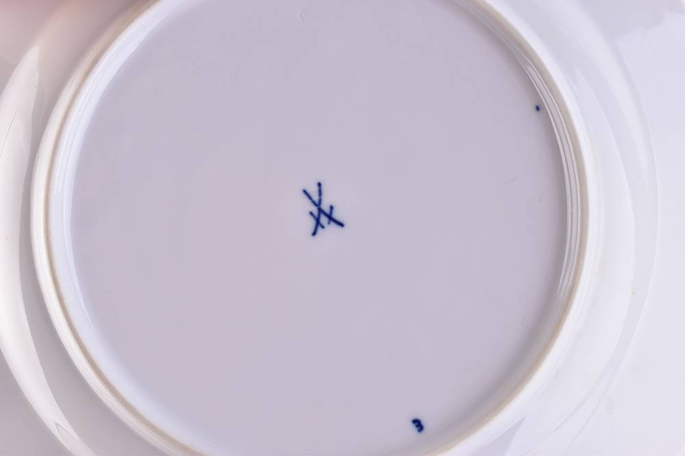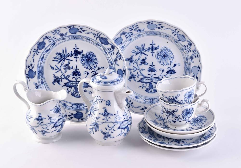 Porzellan, 10 tlg., farbig staffiert, Dekor Zwiebelmuster, 2 Tassen (H: 6,5 cm), 2 Untertassen (Ø 14,5 cm), 2 Kuchenteller (Ø 16,5 cm), 2 Speiseteller (Ø 22,5 cm), 1 Sahnegießer (H: 12 cm) und eine Mokkakanne (H: 16,5 cm)