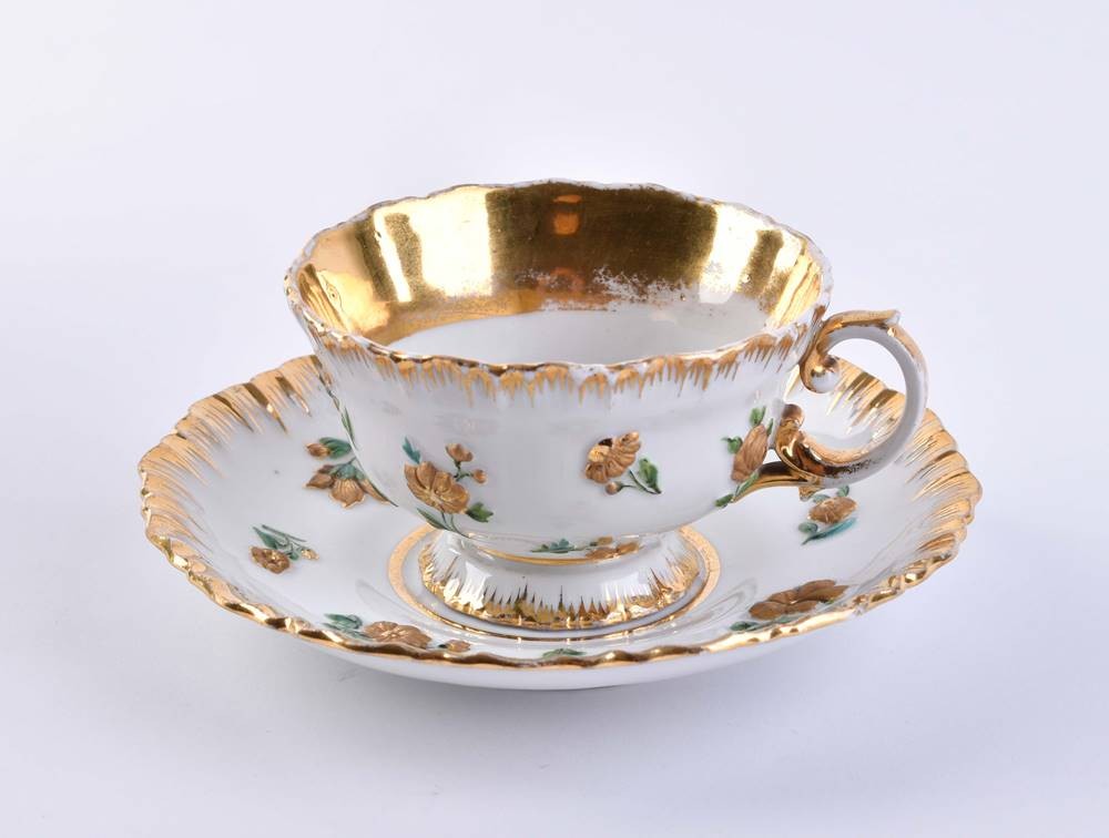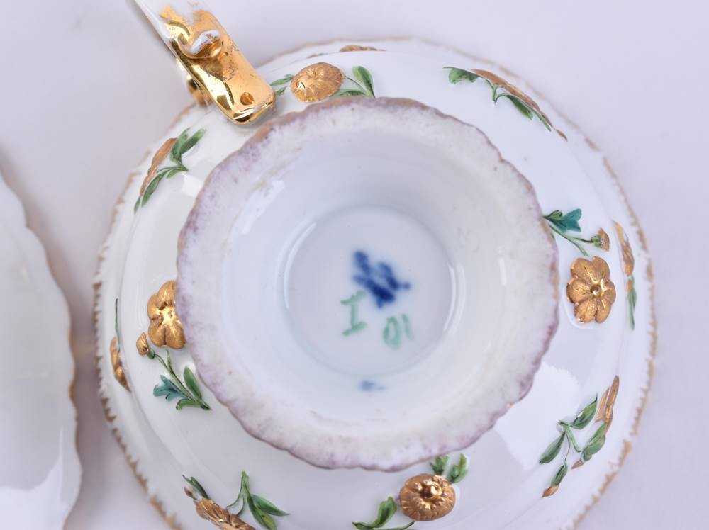 Porzellan, farbig und gold staffiert, mit plastisch aufgelegtem Blumendekor, Glanz- und Mattgold, Innenvergoldung der Tasse etwas berieben, blaue Schwertermarke, Tassenhöhe: 6 cm, Untertasse Ø 15 cm