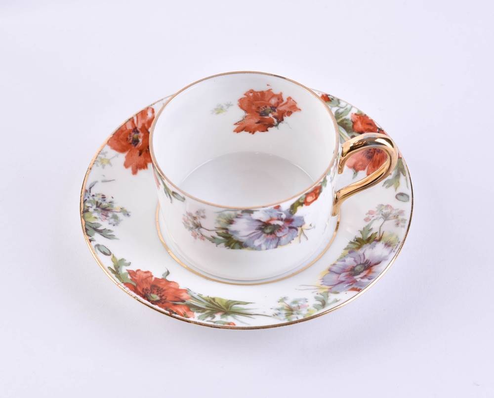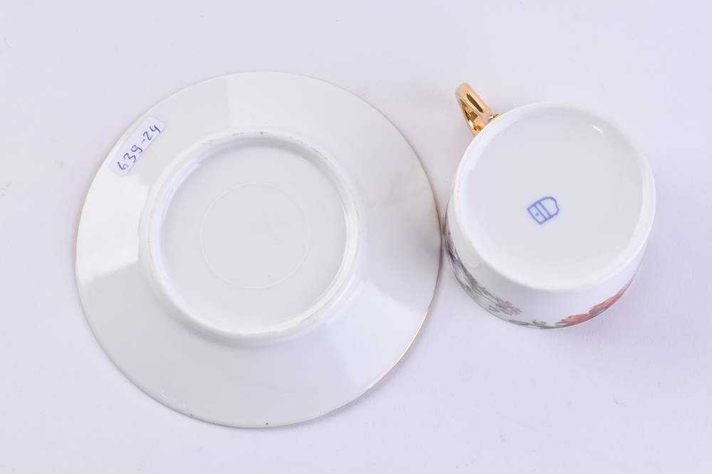 Porzellan, farbig und gold staffiert, Blumendekor, Bodenmarke, Tassenhöhe: 3,5 cm, Untertasse: Ø 10,5 cm