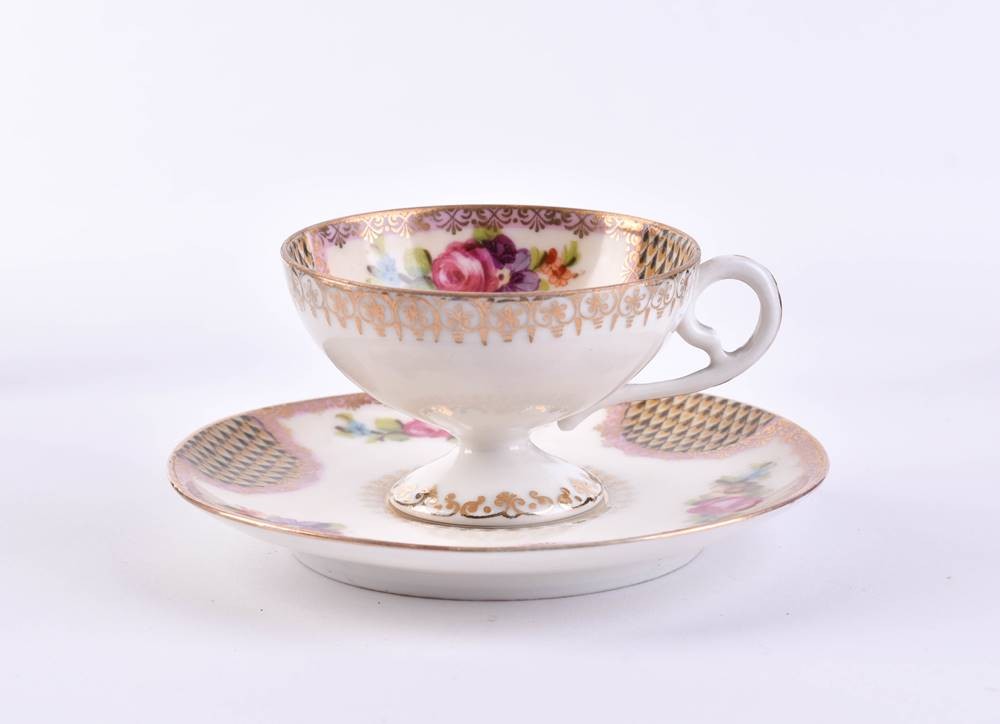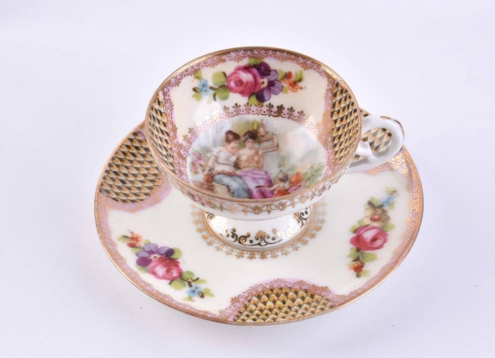 Porzellan, farbig und gold staffiert, mit figürlichem und Blumendekor, Goldspitze und Ornamentik, Tassenhöhe: 4,5 cm, Untertasse: Ø 11 cm