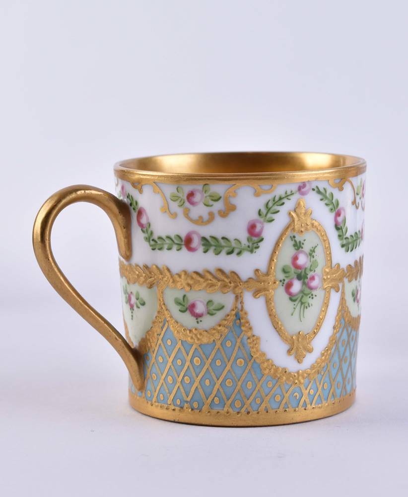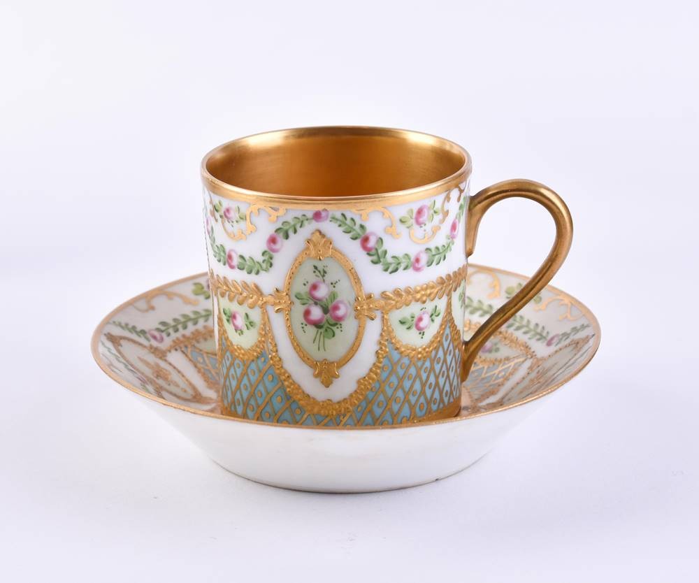 Porzellan, farbig und reich Mattgold staffiert, Innenvergoldung, umlaufender Blumendekor, in der Art von Lemoges, Tassenhöhe: 5 cm, Untertasse: Ø 9,5 cm