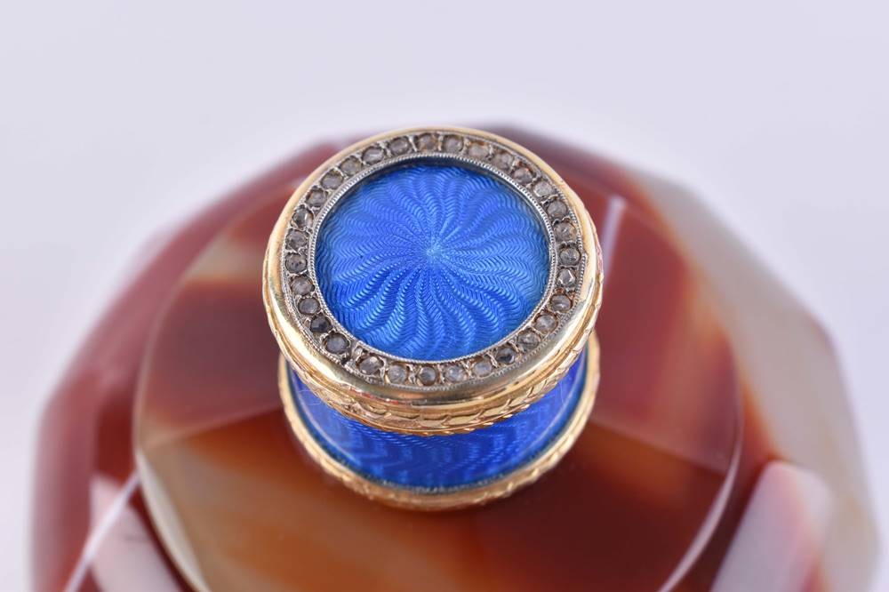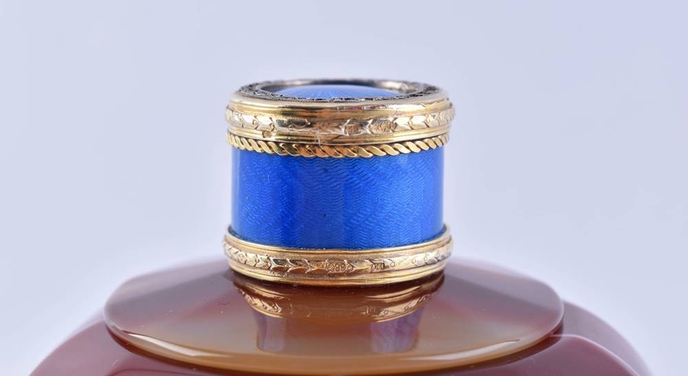 Deckelhandhabe Silber vergoldet 88 Zolotnik, kyrillische Meisterpunze, verziert mit blauer Gouilloche-Emaille, H: 8 cm, Ø 7,5 cm