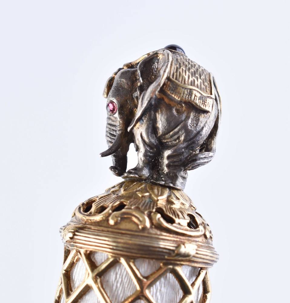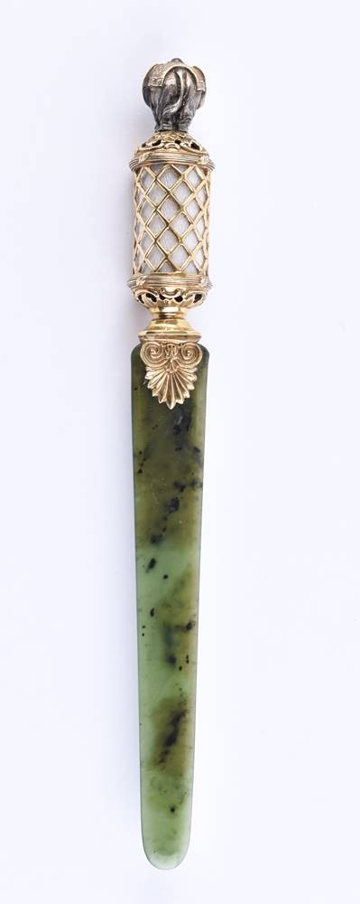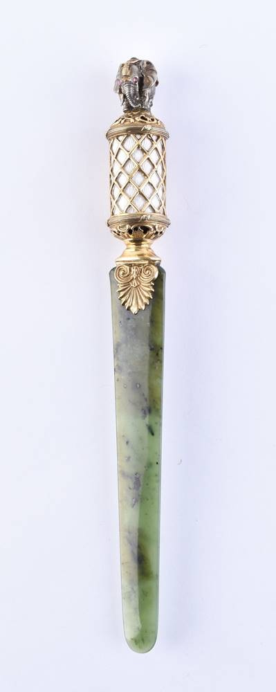 Silber, teils vergoldet, 88 Zolotnik, kyrillische Meisterpunze, Klinge Nephrit- Jade, Griff verziert mit weißer Guilloche Emaille, Griff Ende in Form eines vollplastischen Elefanten mit zwei Granataugen, Gesamtlänge ca. 22,5 cm