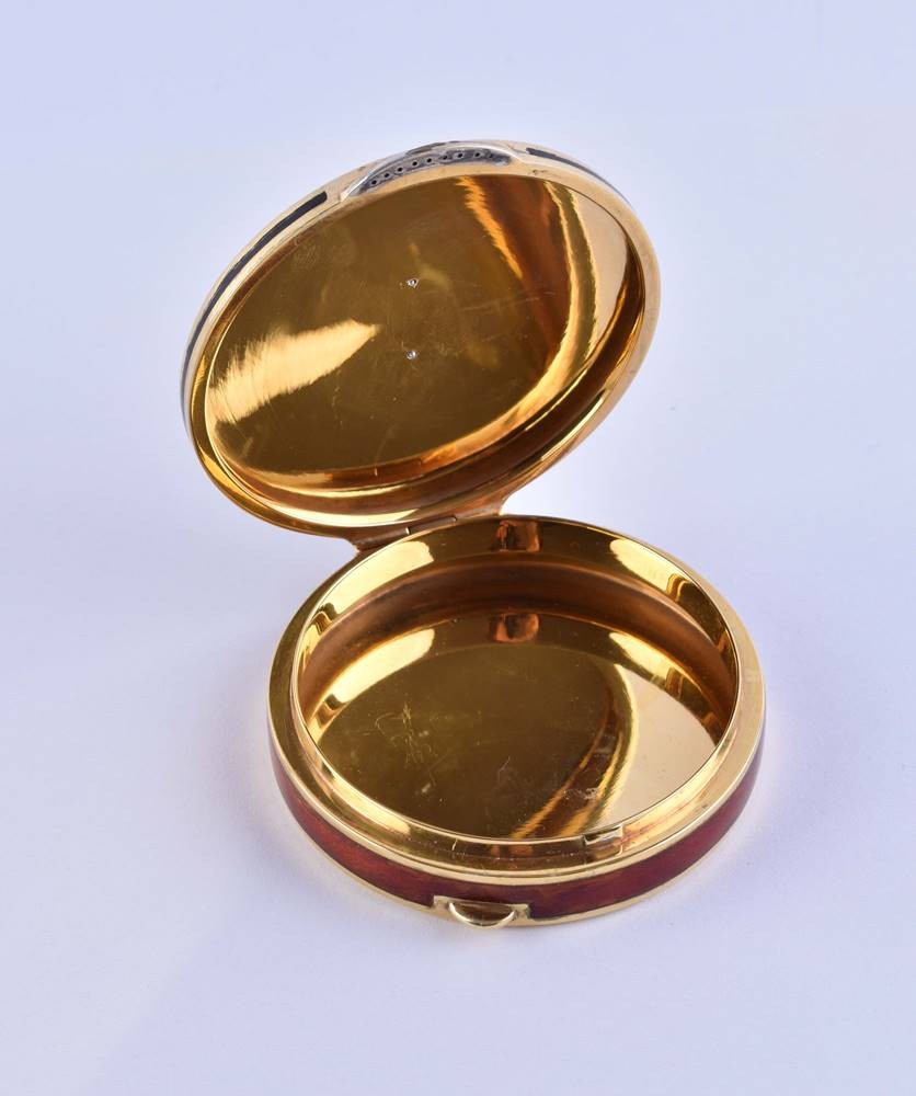 Silber vergoldet 88 Zolotnik, kyrillische Meisterpunze, verziert mit rotbrauner Gouilloche- Emaille, besetzt mit teils vergoldeter Silberapplikation, Diamanten und Rubinen, Deckel klappbar, H: 1,5 cm, Ø 7 cm, Gesamtgewicht 125 g