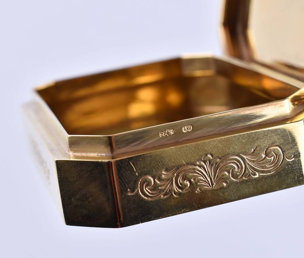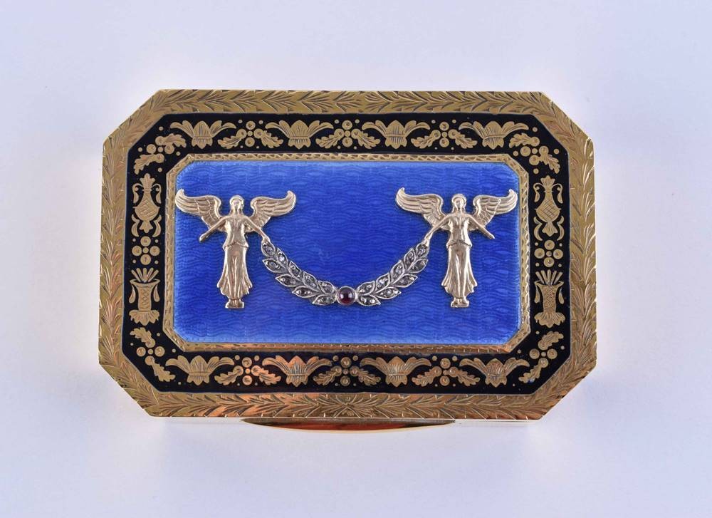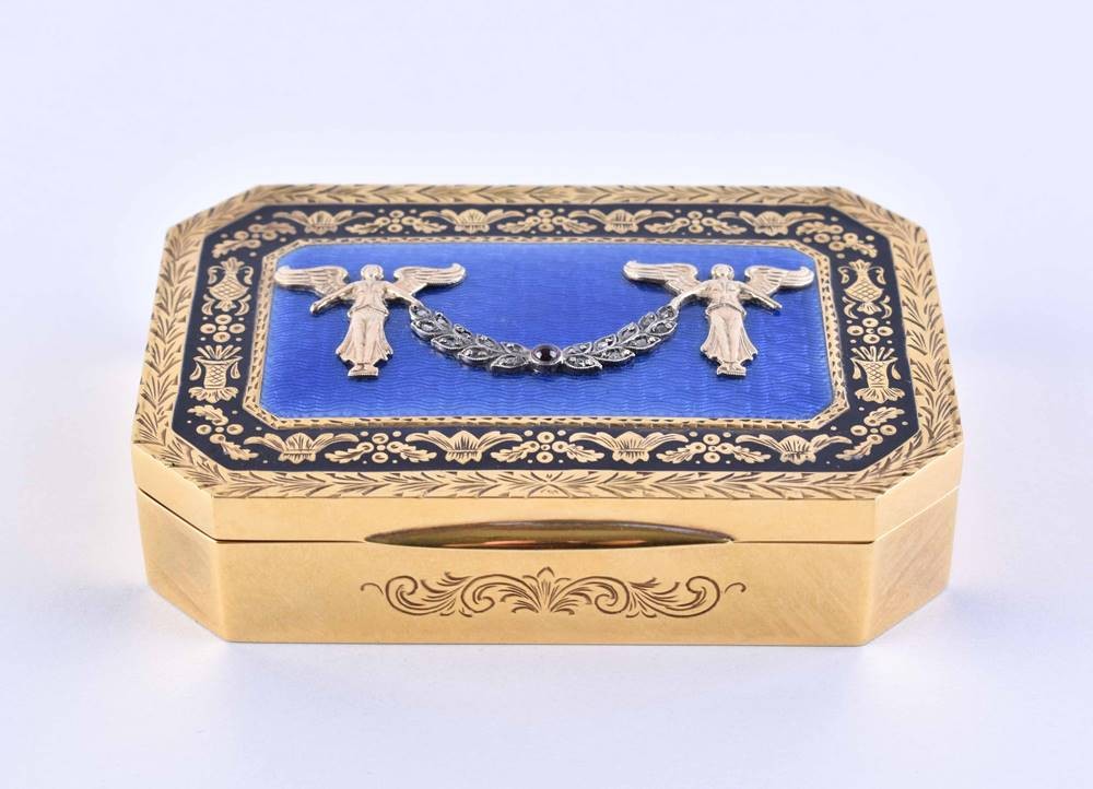 Silber vergoldet 88 Zolotnik, kyrilsche Meisterpunze, umlaufend mit floralem Dekor ziseliert, Deckel verziert mit blauer Gouilloche- Emaille, teils vergoldeten Silberapplikationen, Diamanten und Rubin, 2,3 cm x 9,5 cm x 6 cm, Gesamtgewicht ca. 210 g