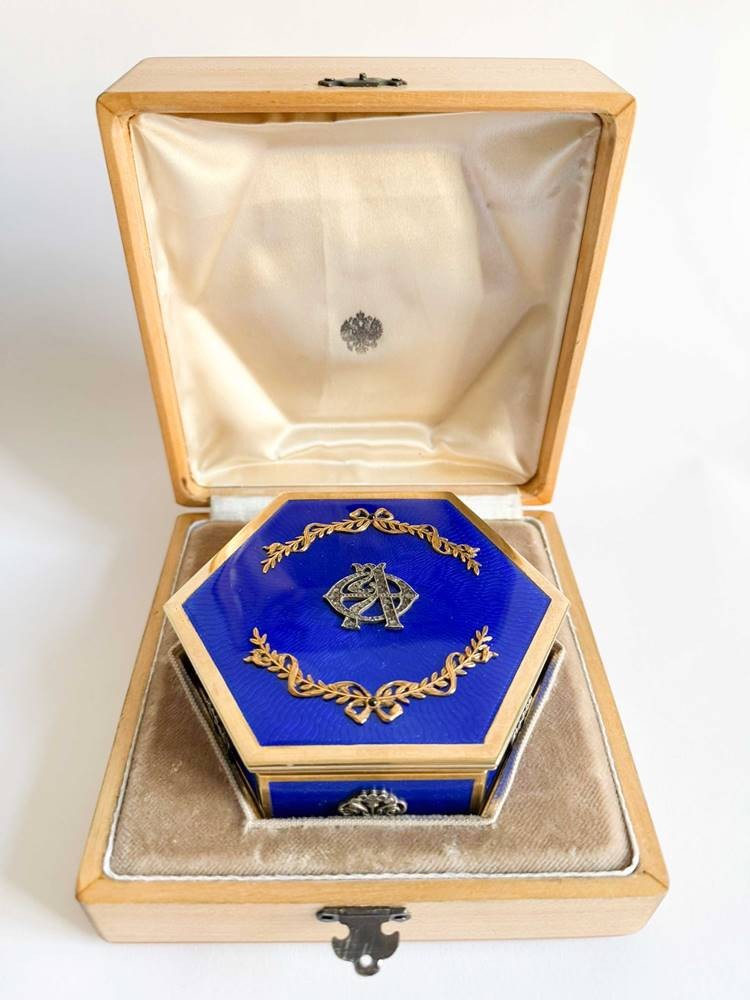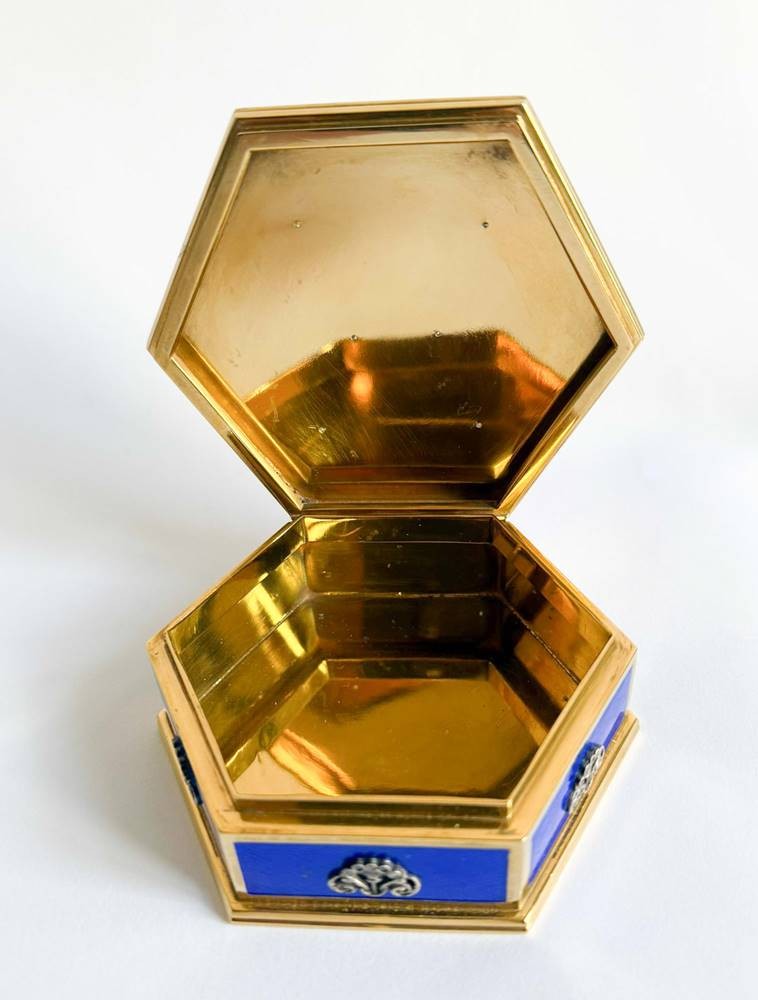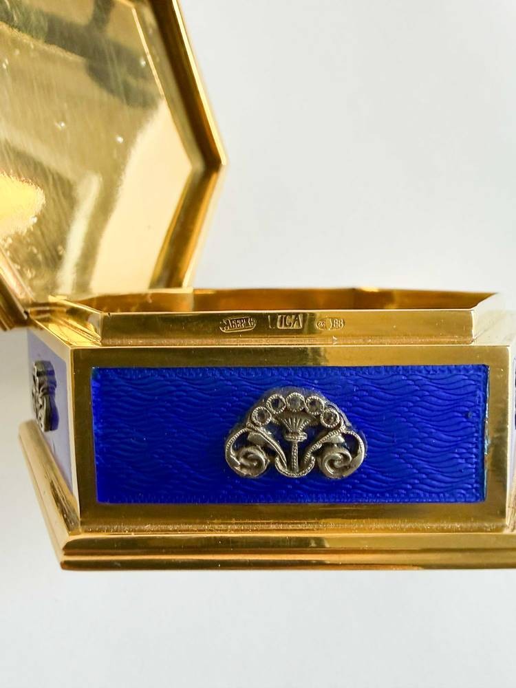 Silber vergoldet, 88 Zolotnik, oktogonale Form, verziert mit blauer Guilloche Emaille, seitlich und auf dem Deckel mit Silberapplikationen besetzt, diese teils mit Diamanten verziert, kyrillische Meisterpunze, aufklappbar, dabei dazugehöriges Holzetui, H. 3,5 cm, ⌀ 10,6 cm