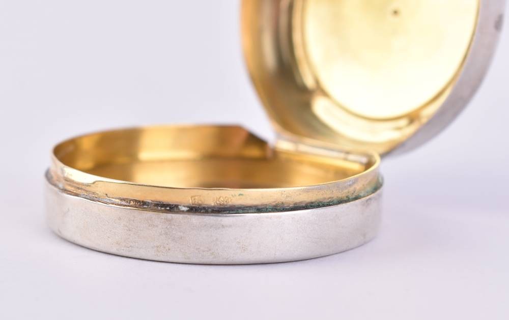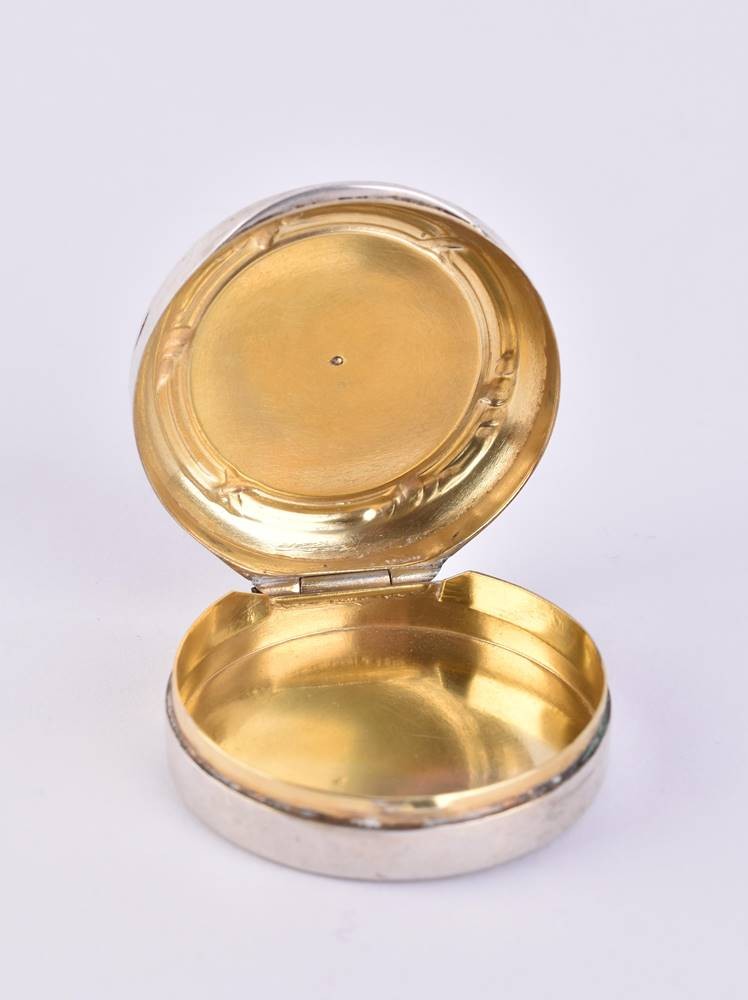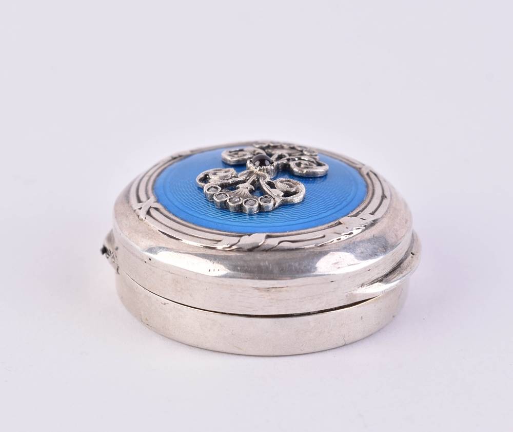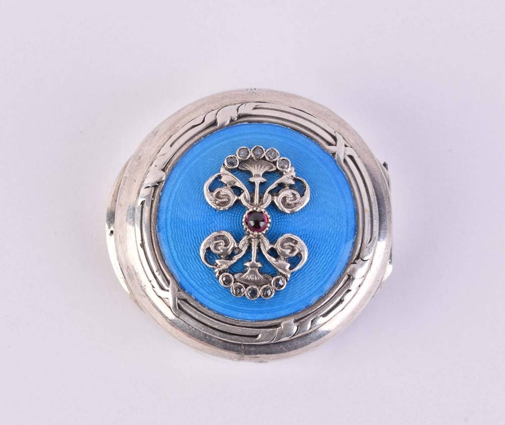 Silber, innen vergoldet, 88 Zolotnik, kyrillische Meisterpunze, Deckel aufklappbar mit Scharnier, Deckel verziert mit hellblauer Guilloche Emaille und Silberapplikationen, diese besetzt mit kleinen Diamanten, mittig Granat, ca. 1,8 cm x ⌀ 4,2 cm