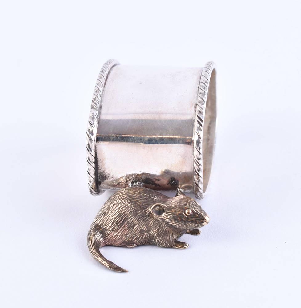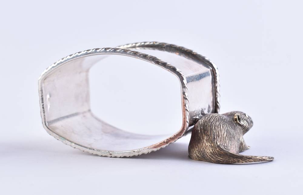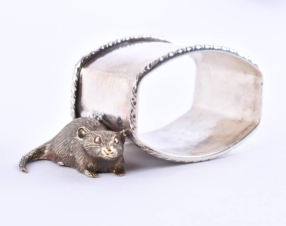 Silber, 84 Zolotnik, Kokoschnik nach links, seitlich plastisch aufgesetzte Tierfigur in Form einer Ratte vergoldet, kyrillische Meisterpunze, ca. 3,4 cm x 5,4 cm x 3,6 cm, Gesamtgewicht ca. 68 g.