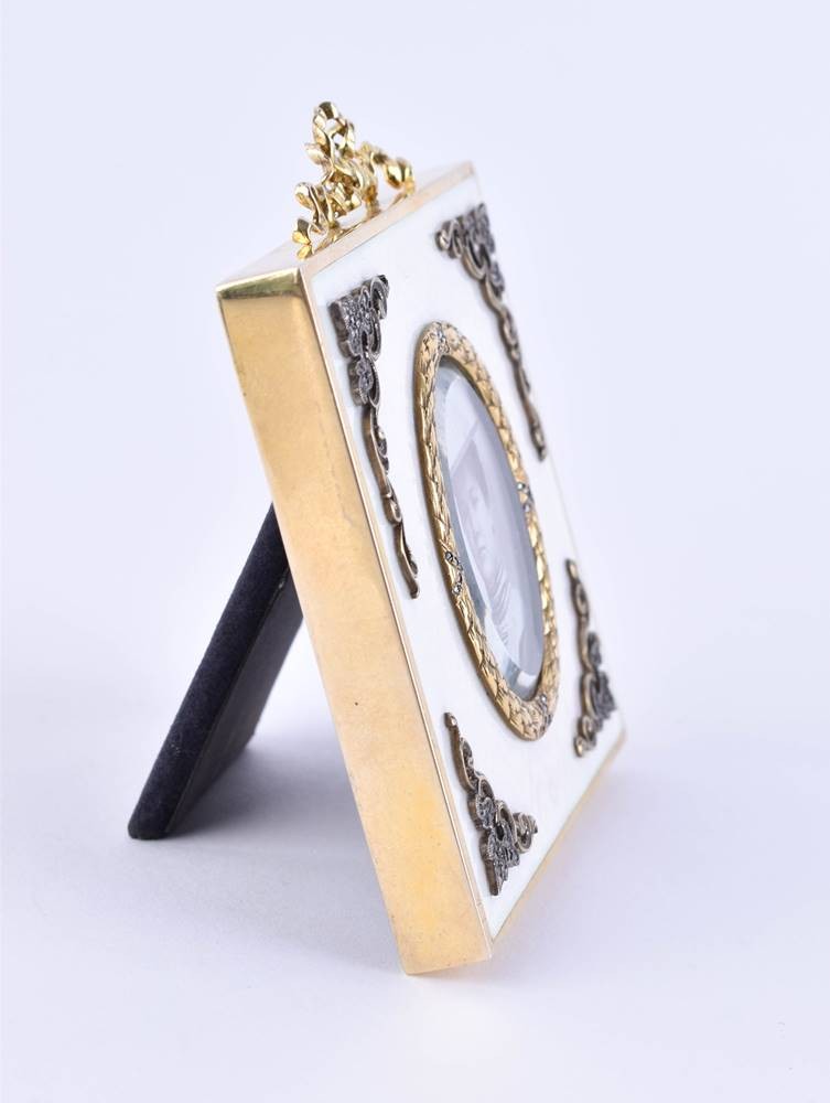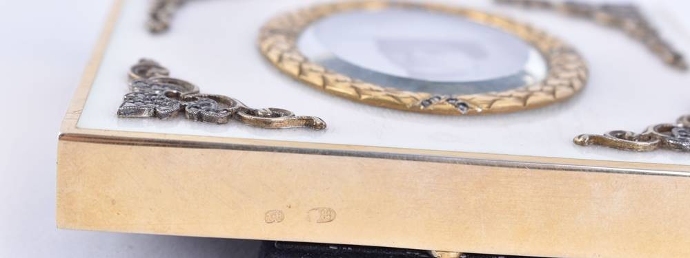 Silber vergoldet, 88 Zolotnik, kyrillische Meisterpunze, verziert mit weißer Guilloche Emaille und aufgesetzten teils vergoldeten Silberapplikationen, mittig Foto einer jungen Dame, ca. 8 cm x 8 cm