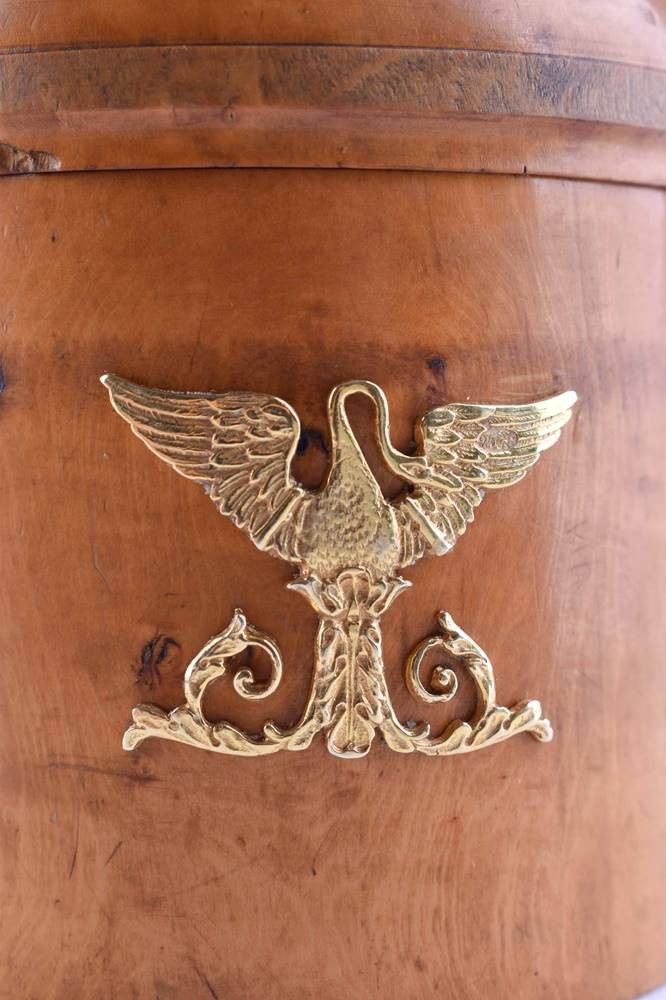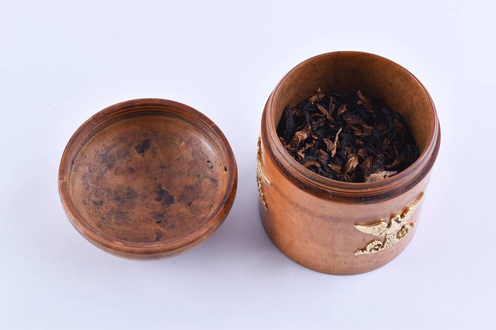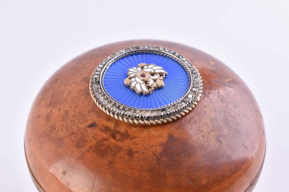 Holz, russische Birke, Deckel abschraubbar, umlaufend verziert mit vergoldeten Silberapplikationen 84 Zolotnik, kyrillische Meisterpunze, auf dem Deckel Silberapplikation verziert mit blauer Gouilloche-Emaille und Diamanten, H: 10 cm, Ø 7,3 cm