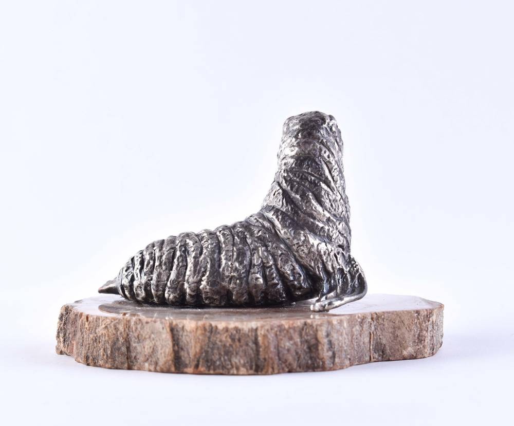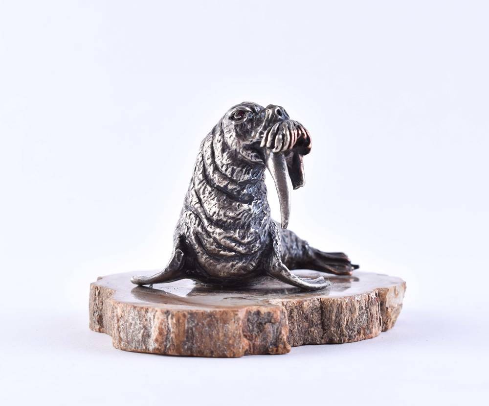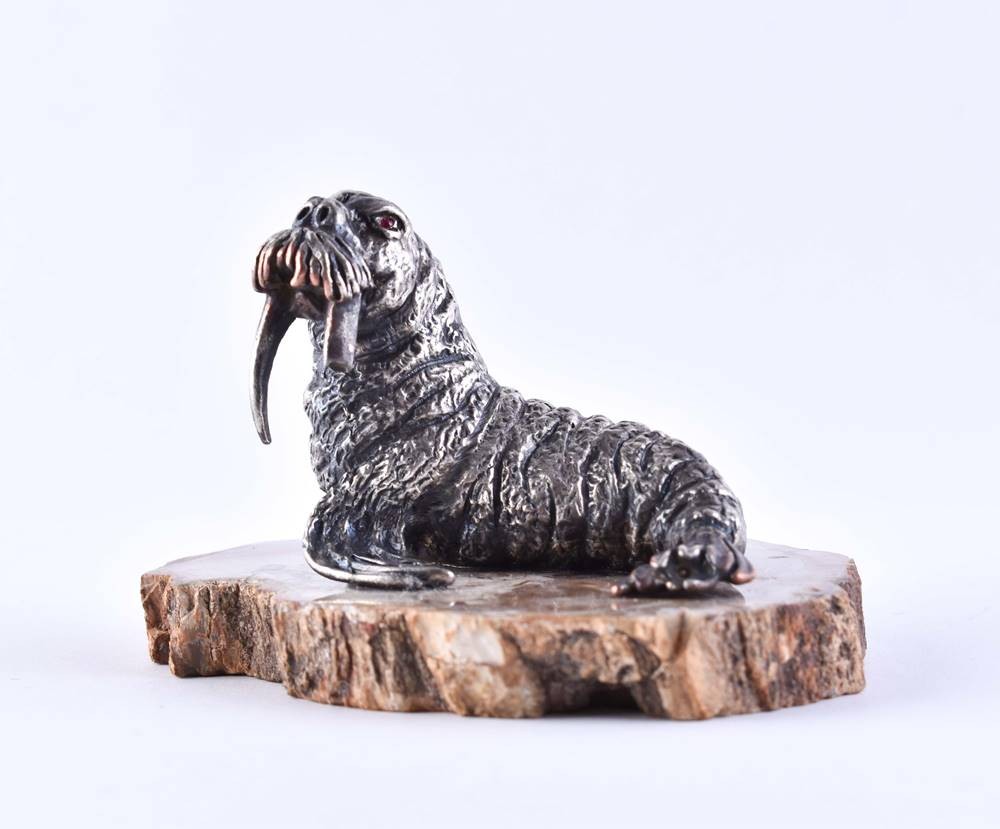 Walroß, Silber 84 Zolotnik, kyrillische Meisterpunze, auf Achatsockel, Rubinaugen, Gesamthöhe: 6 cm, Gesamtgewicht: ca. 200 g