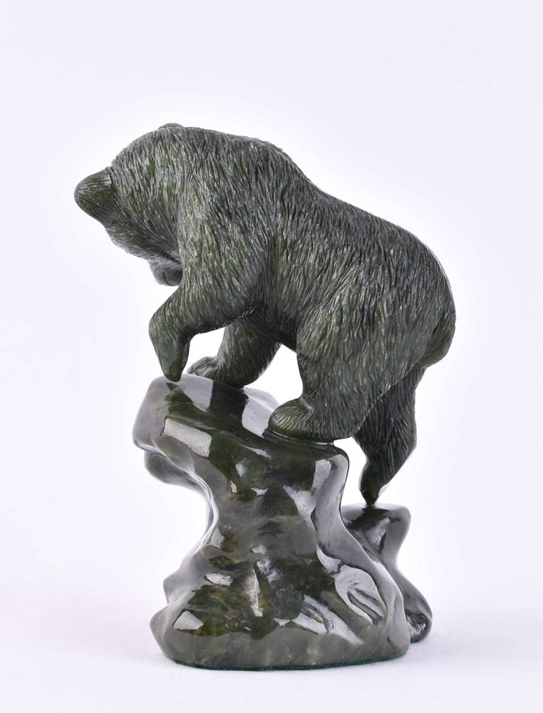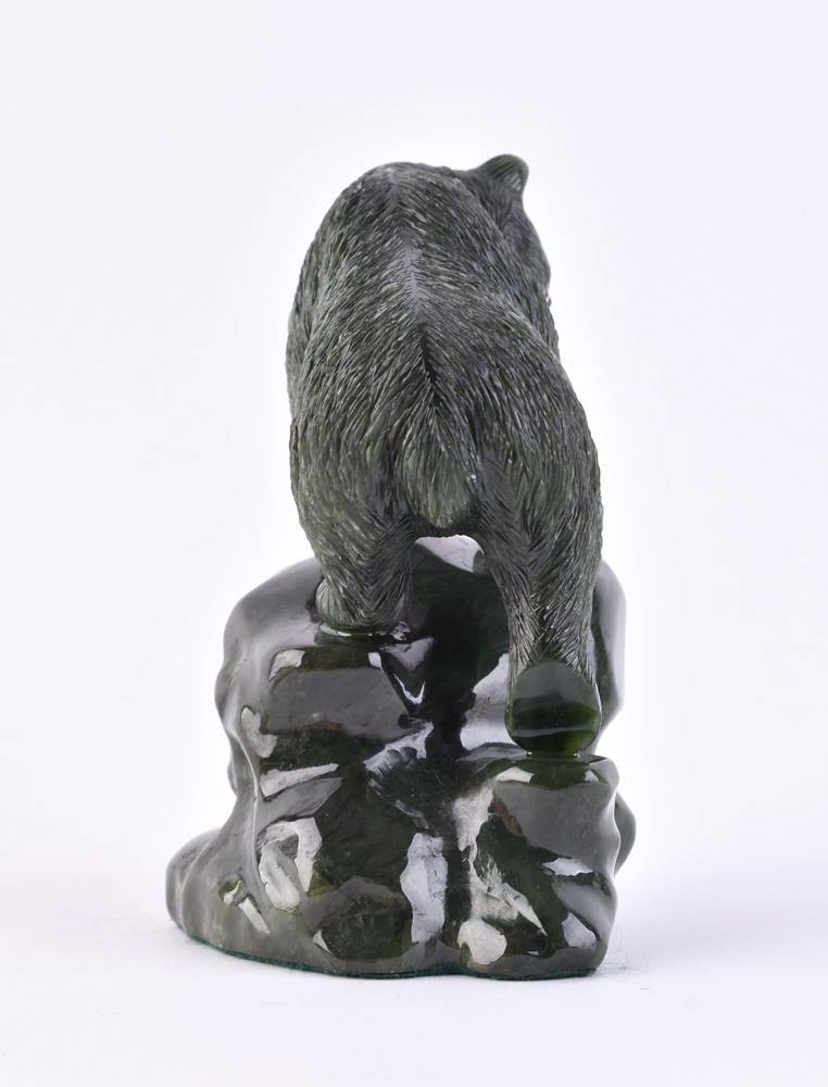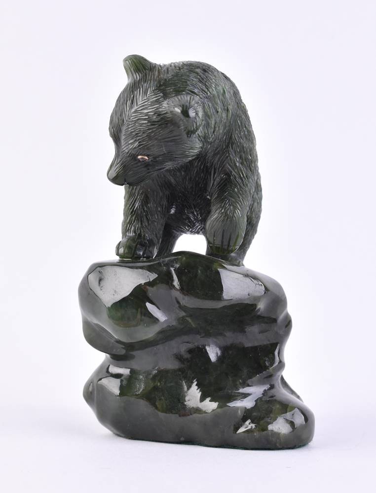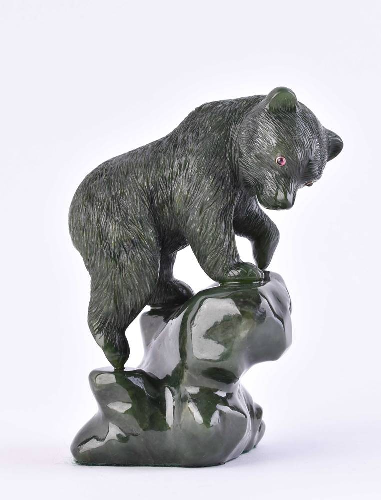 in Form eines Bären, Nephrit- Jade, fein geschnitzt, auf naturalistischem Sockel stehend, Granataugen in vergoldeter Silberfassung, H. 12 cm