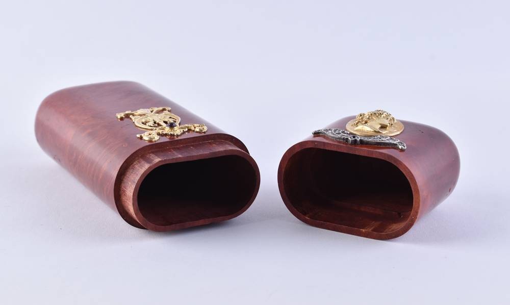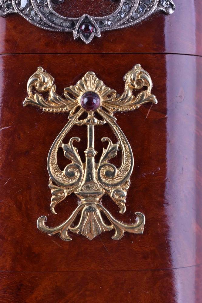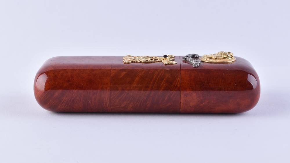 Holz, russische Birke, schauseitig teils vergoldete Silberapplikationen mit Diamantbesatz und Rubin, 3 cm x 13 cm x 5 cm