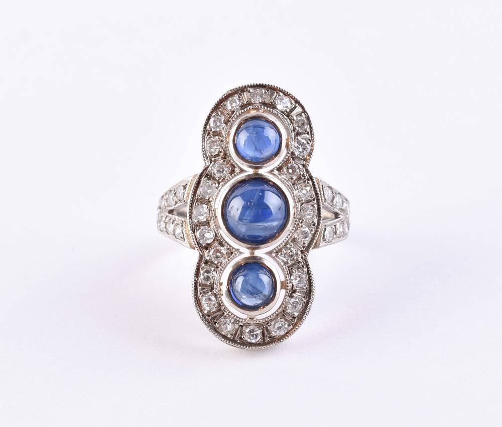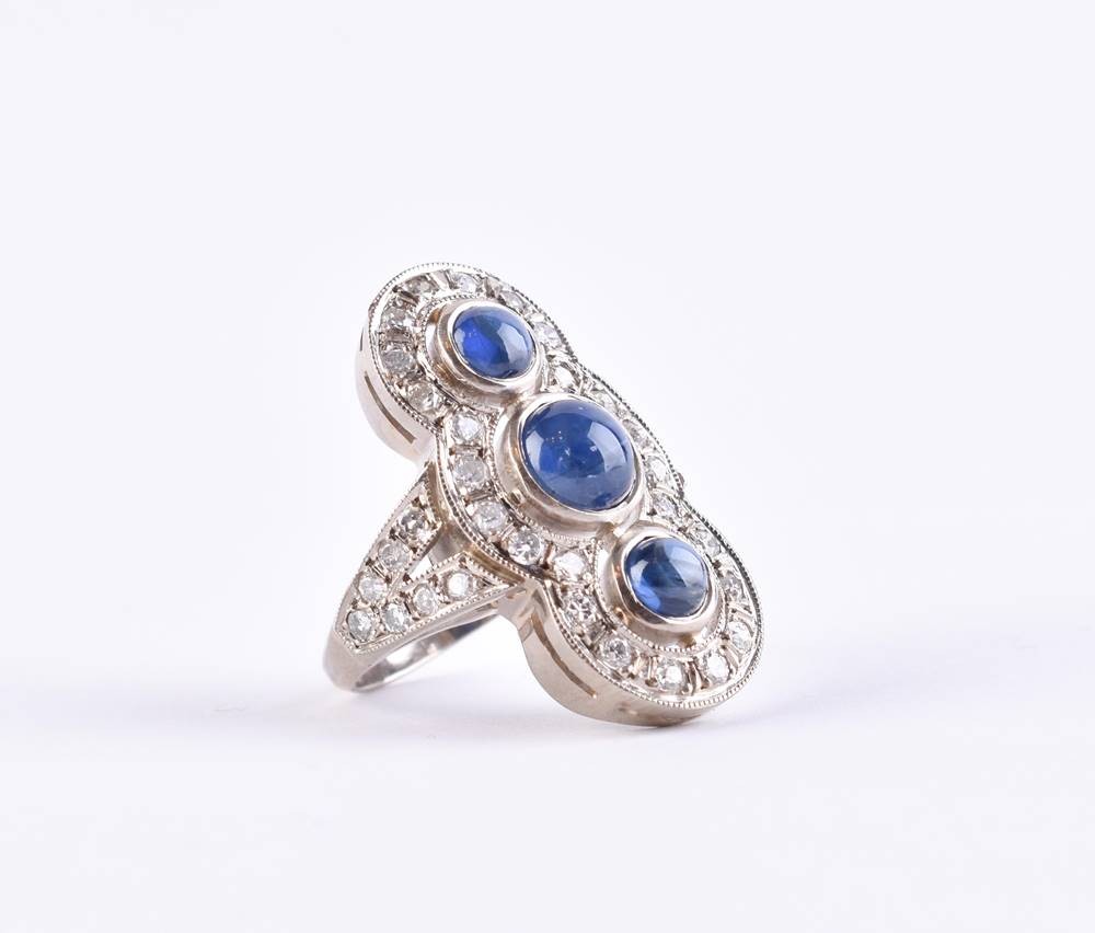 Platin, geprüft und gepunzt, drei natürliche Saphire Total ca. 1,5 ct, 44 Brillanten Total über 1,5 ct, Ringgröße 53, Gesamtgewicht ca. 7 g.