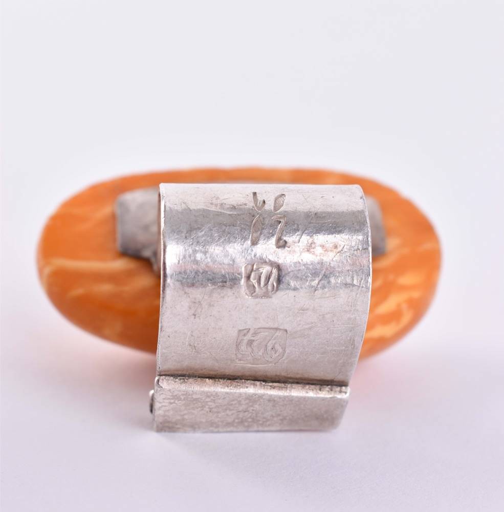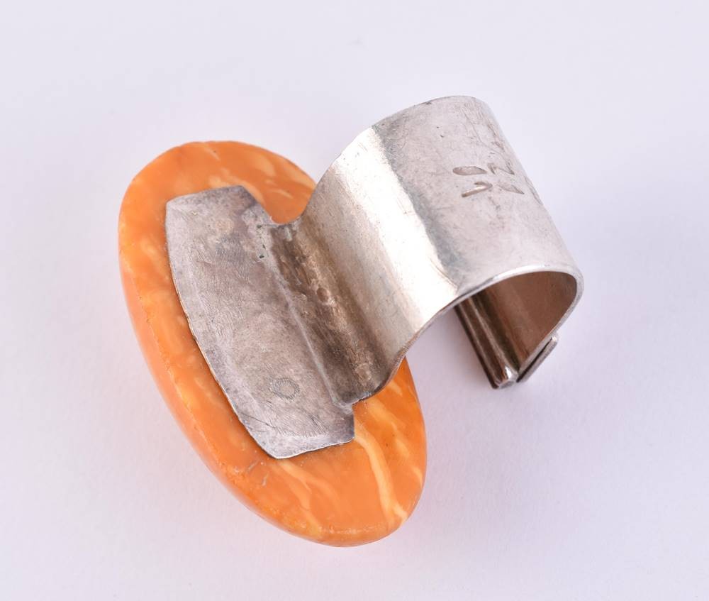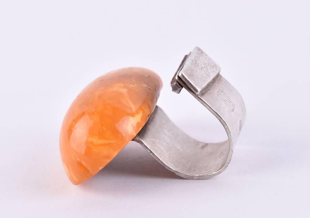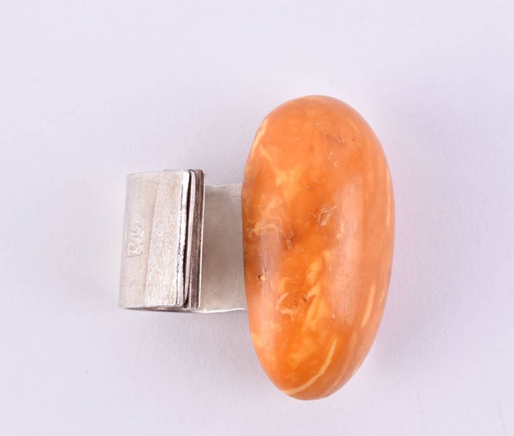 Silber 925/000, Farbe butterscotch, RG ca. 55, Maße des Bernsteins: 46 mm x 25 mm x 17 mm, Gesamtgewicht ca. 25,7 g.