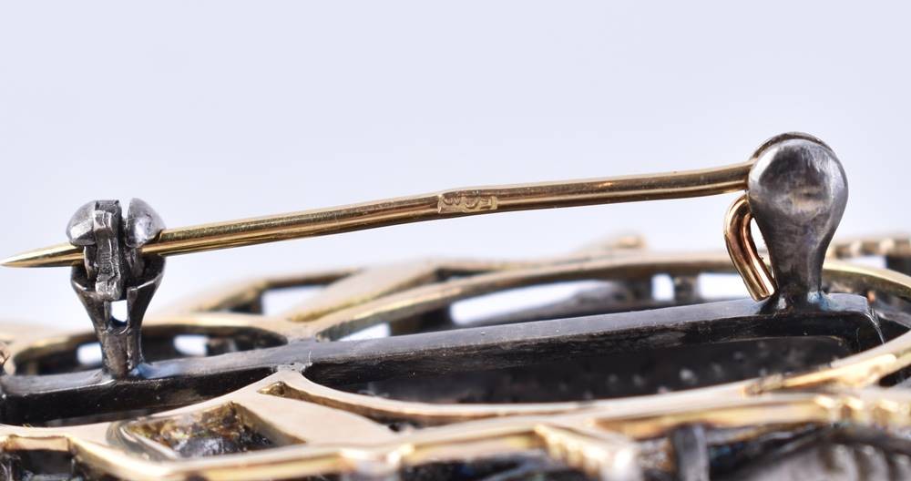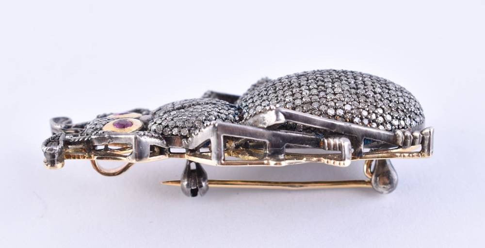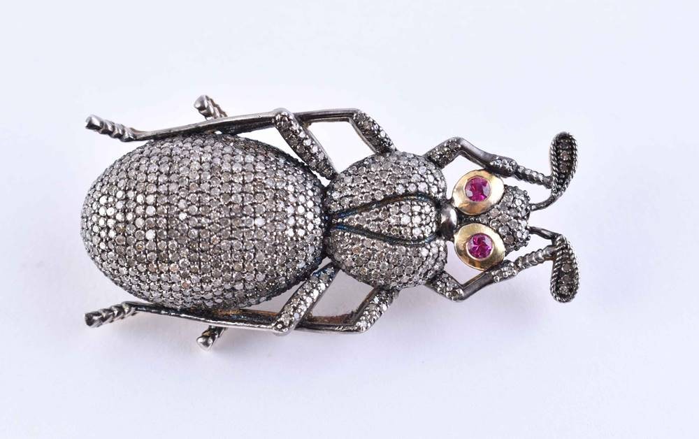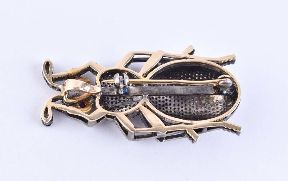 Gold 65 Zolotnik gestempelt, mit Diamantbesatz, in Form einer Zikade, zusammen ca. 2,76 ct., ca. 1 cm x 5 cm x 2,2 cm, Gesamtgewicht: ca. 16 g.