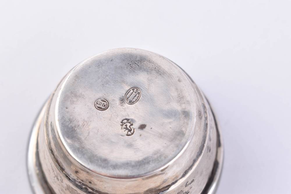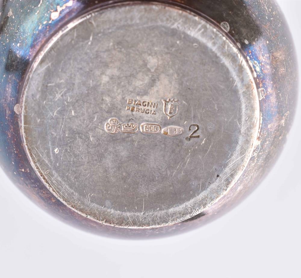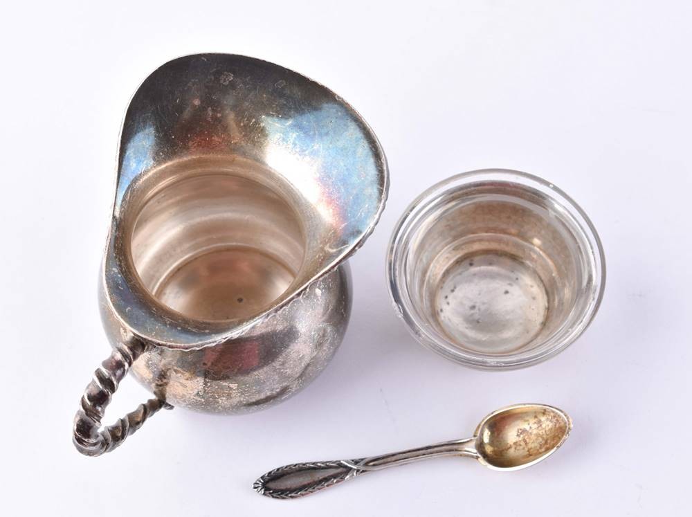 Silber 800/000 und Sterling, 1 Sahnegießer (H. 6 cm) und 1 Saliere mit Glaseinsatz und kleinem Löffel (H. 2,5 cm x ⌀ 45 mm), Gesamtgewicht ohne Glaseinsatz: ca. 105 g.