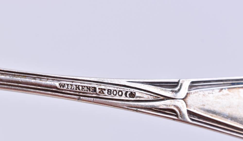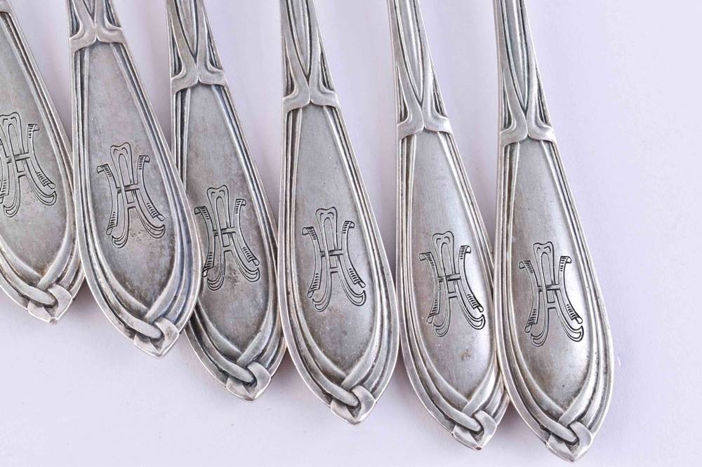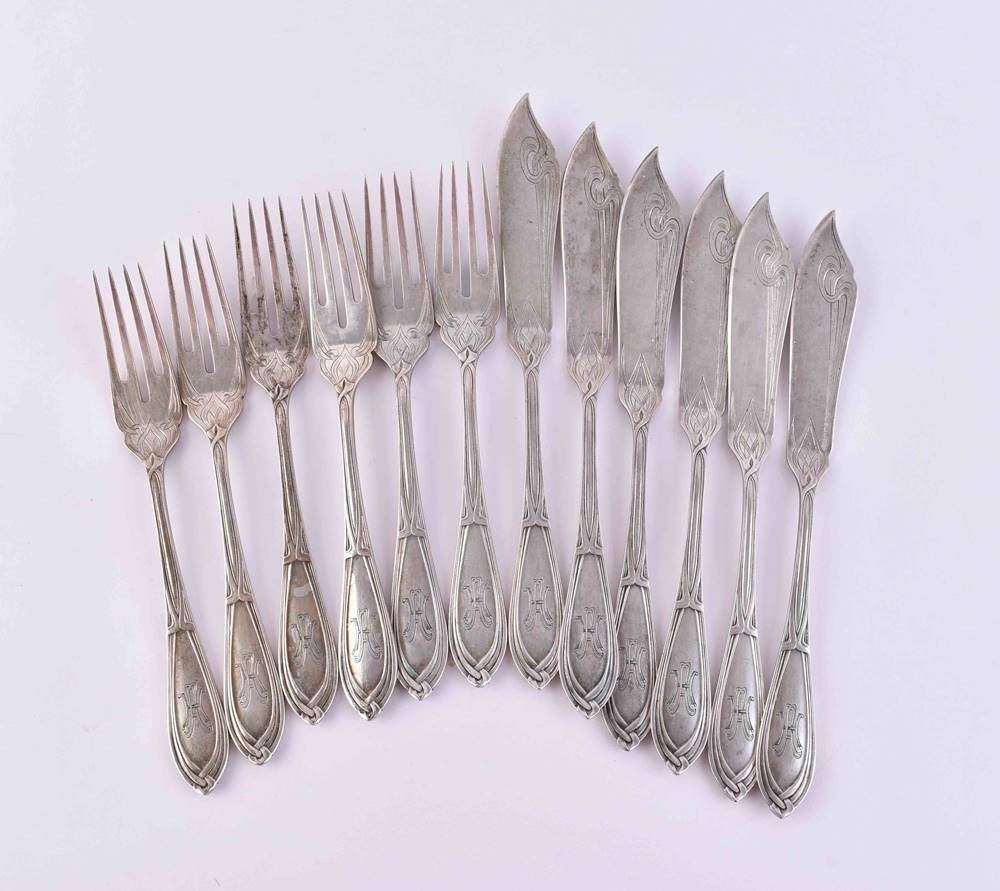 Silber 800/000, 12 Teile, 6 Gabeln (L. 17,5 cm), 6 Fischmesser (L. 20,5), Gesamtgewicht: ca. 394 g.