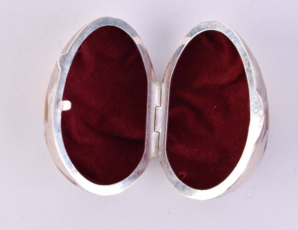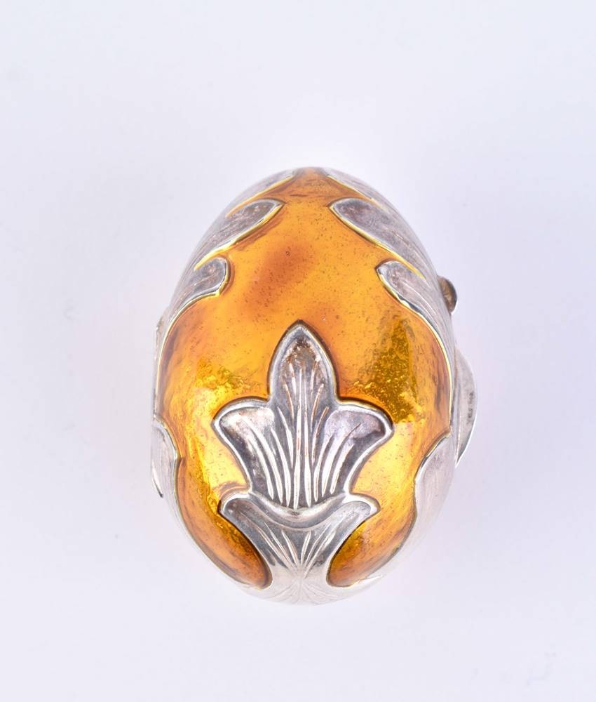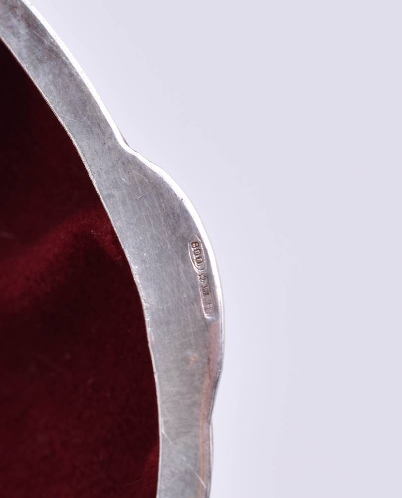 Silber 800/000, verziert mit gelber Emaille und umlaufend floralem Dekor, aufklappbar mit Scharnier, innen ausgelegt mit rotem Samt, H. 6,2 cm, Gesamtgewicht: ca. 37 g.