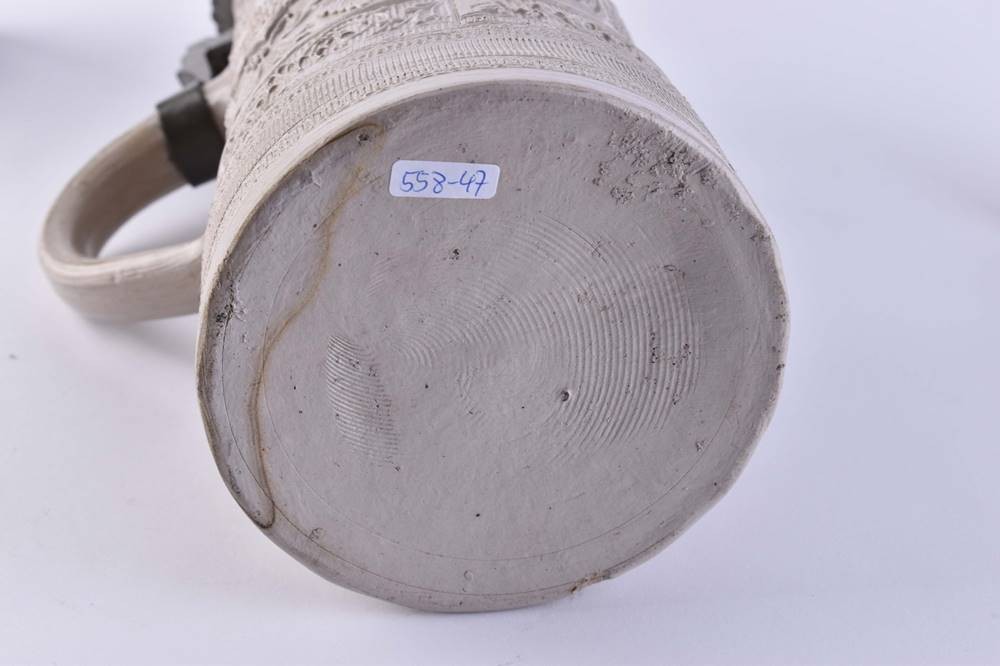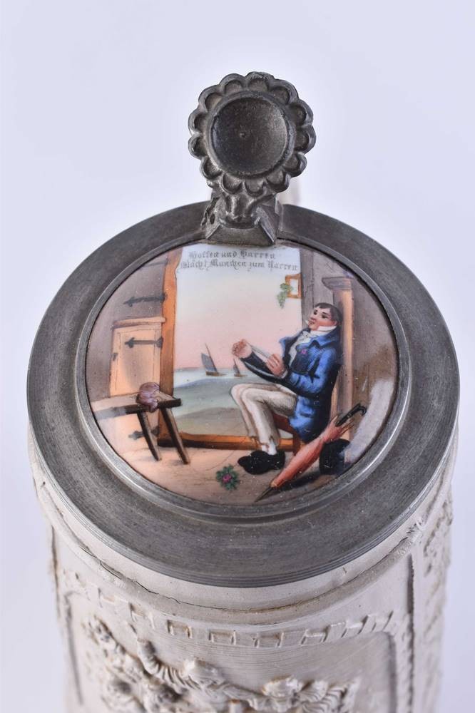 Keramik, reliefierte Wandung, Zinndeckel mit eingelegter Porzellanbildplatte, Daumenrast in Form eines Löwen, H: 25 cm