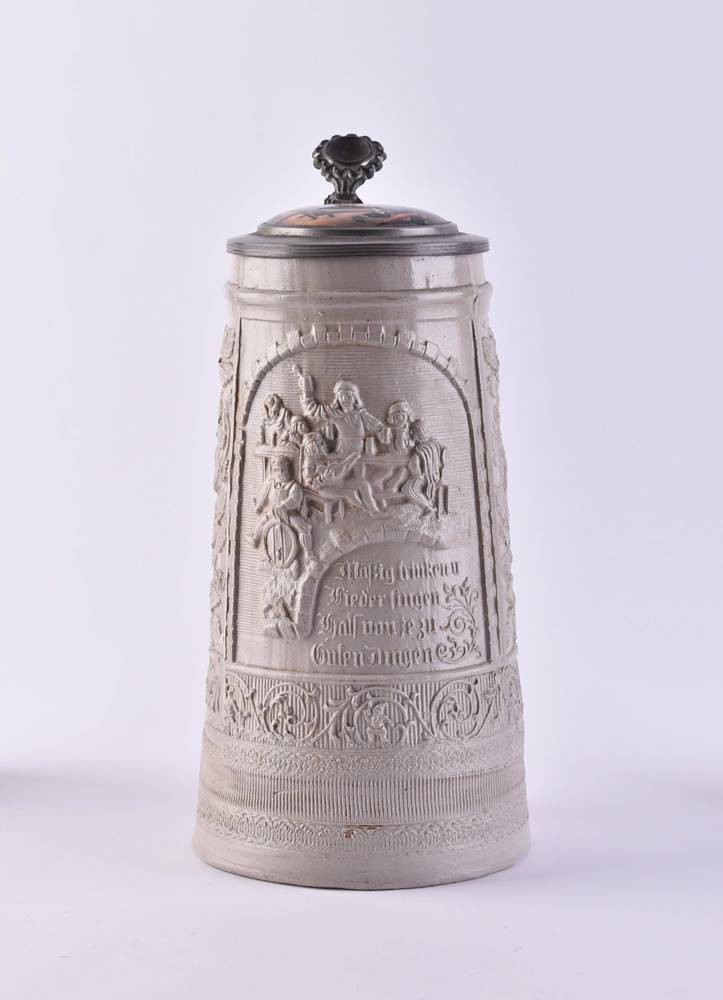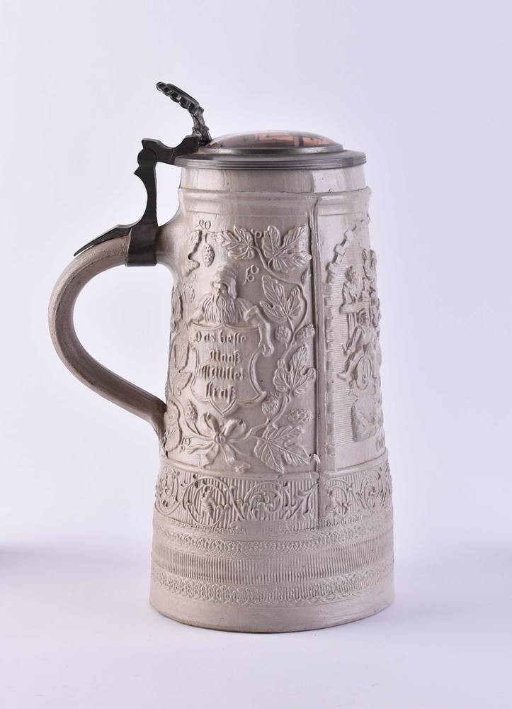 Keramik, reliefierte Wandung, Zinndeckel mit eingelegter Porzellanbildplatte, Daumenrast in Form eines Löwen, H: 25 cm
