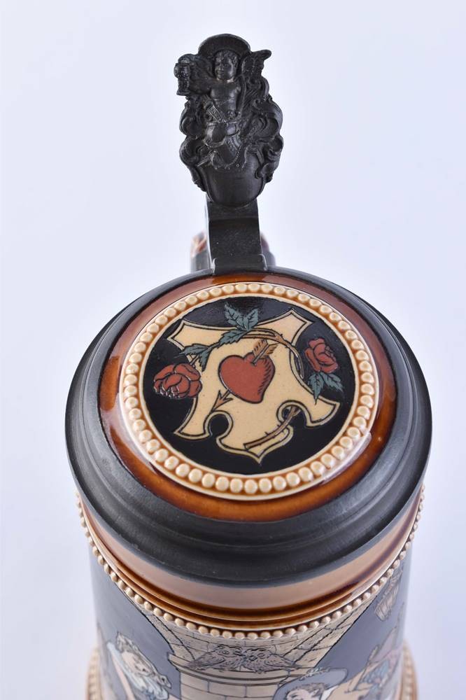 Steinzeug, farbig staffiert, Zinndeckel und Daumenrast, Zinndeckel mit eingelegter Porzellanbildplatte, Bodenmarke, Modellnr. 2780, H: 24,5 cm