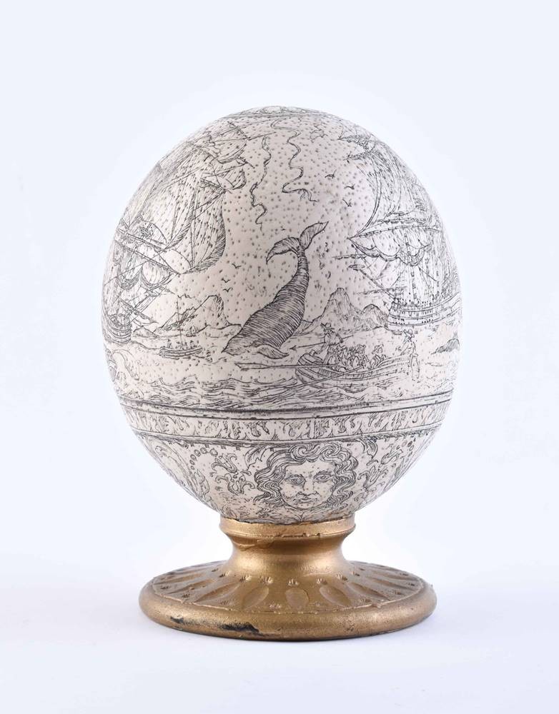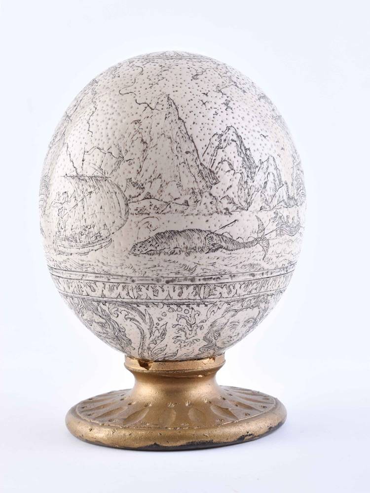 Graviertes Resin-Straußenei in Scrimshaw-Manier auf gegossenem Metallstand - Resin (Naturkunstharz), maschinell gefertigt, umlaufender Dekor im Stil von Abraham (Adriaen) und Roelof van Salm mit Darstellung einer arktischen Walfangszenerie mit Dreimastern und Ruderbooten vor steiler karger Felsenküste, im unteren Drittel eine durch einen schmalen Akanthusfries abgesetzte Sockelzone mit Maskarons und Löwenköpfen zwischen großen gerollten Blattrank, Gesamthöhe: 17,5 cm