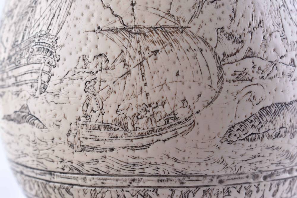 Los 176 - Graviertes Straussenei in Scrimshaw- Manier, um 1900